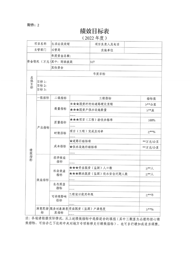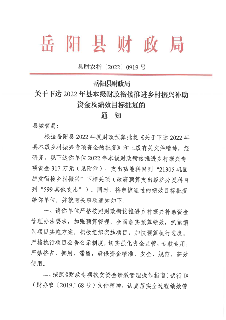 嶽陽縣財政局關於下達2022年縣本級財政銜接推進鄉村振興補助資金及績效目標批複(城管局317)公開公示