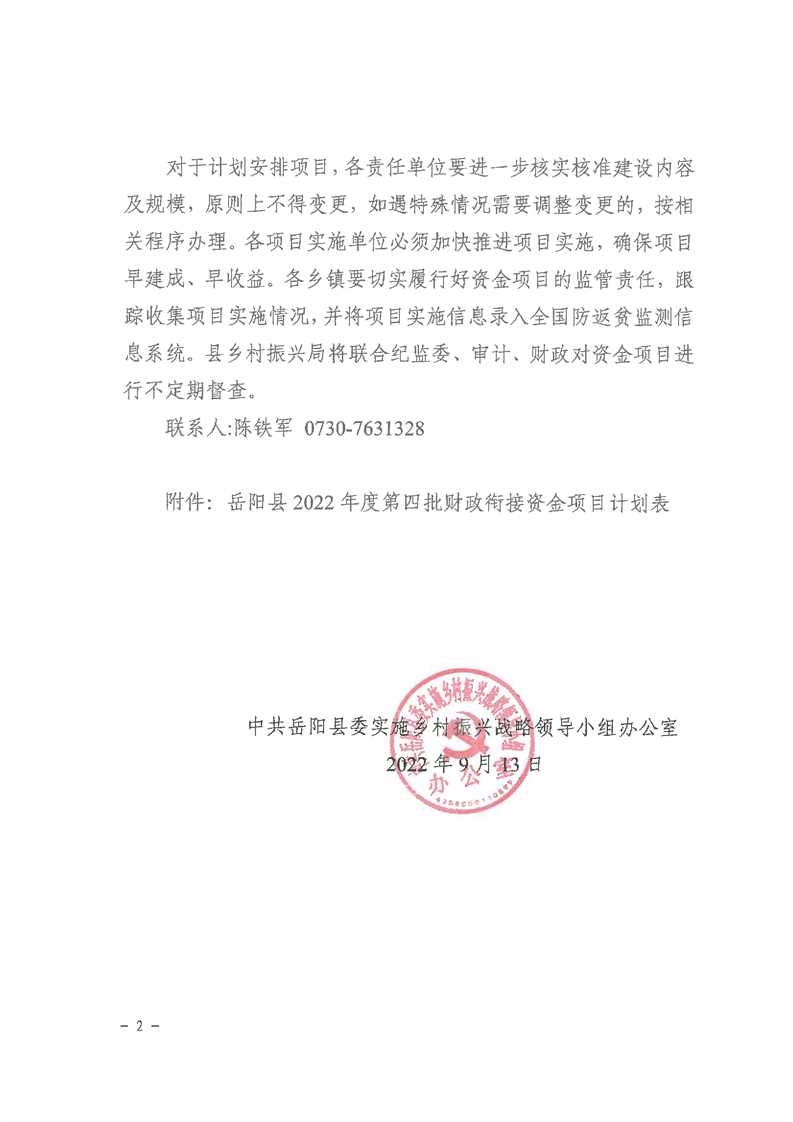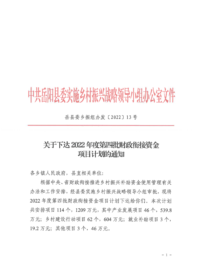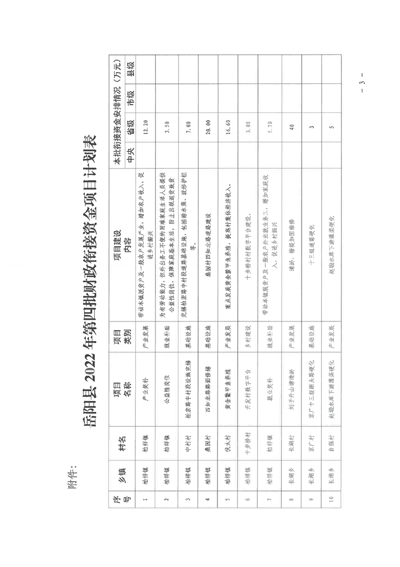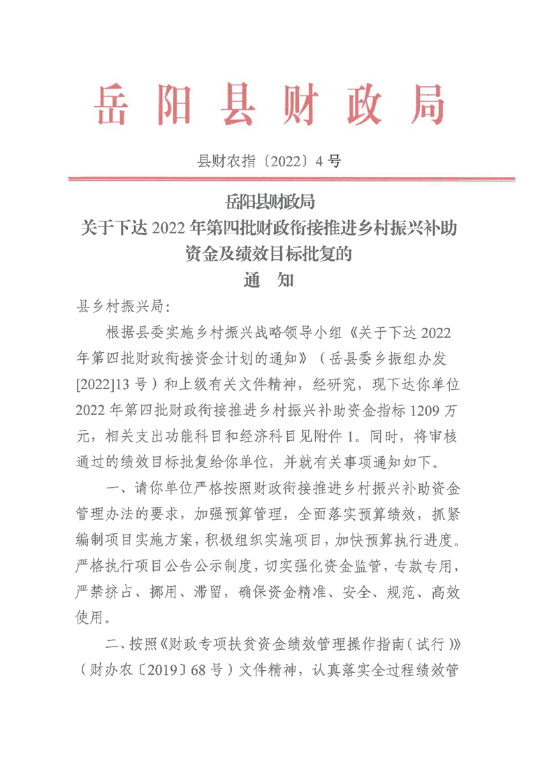 嶽陽縣財政局2022年關於下達第四批財政銜接推進鄉村振興資金及績效目標批複公開公示
