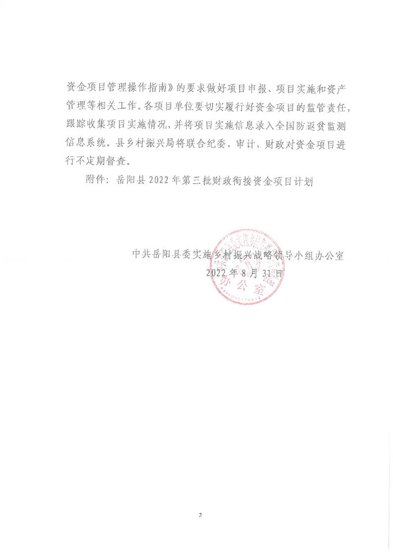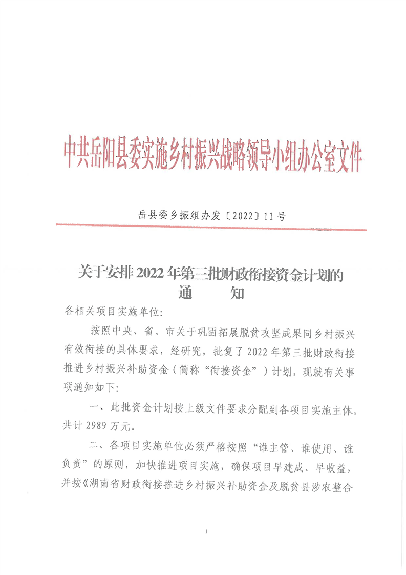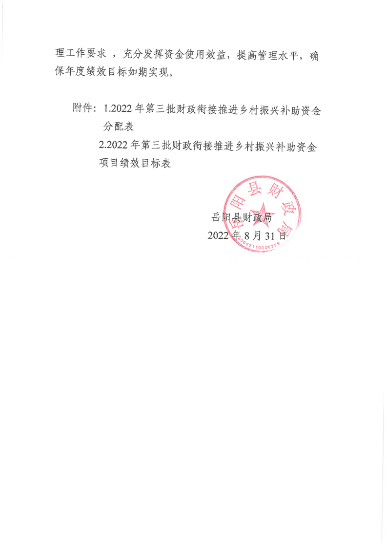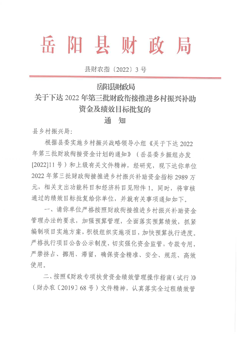 嶽陽縣財政局2022年關於下達第三批財政銜接推進鄉村振興資金及績效目標批複公開公示