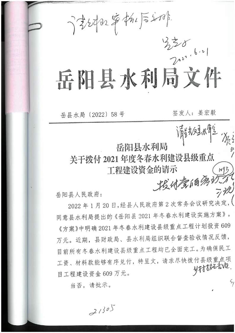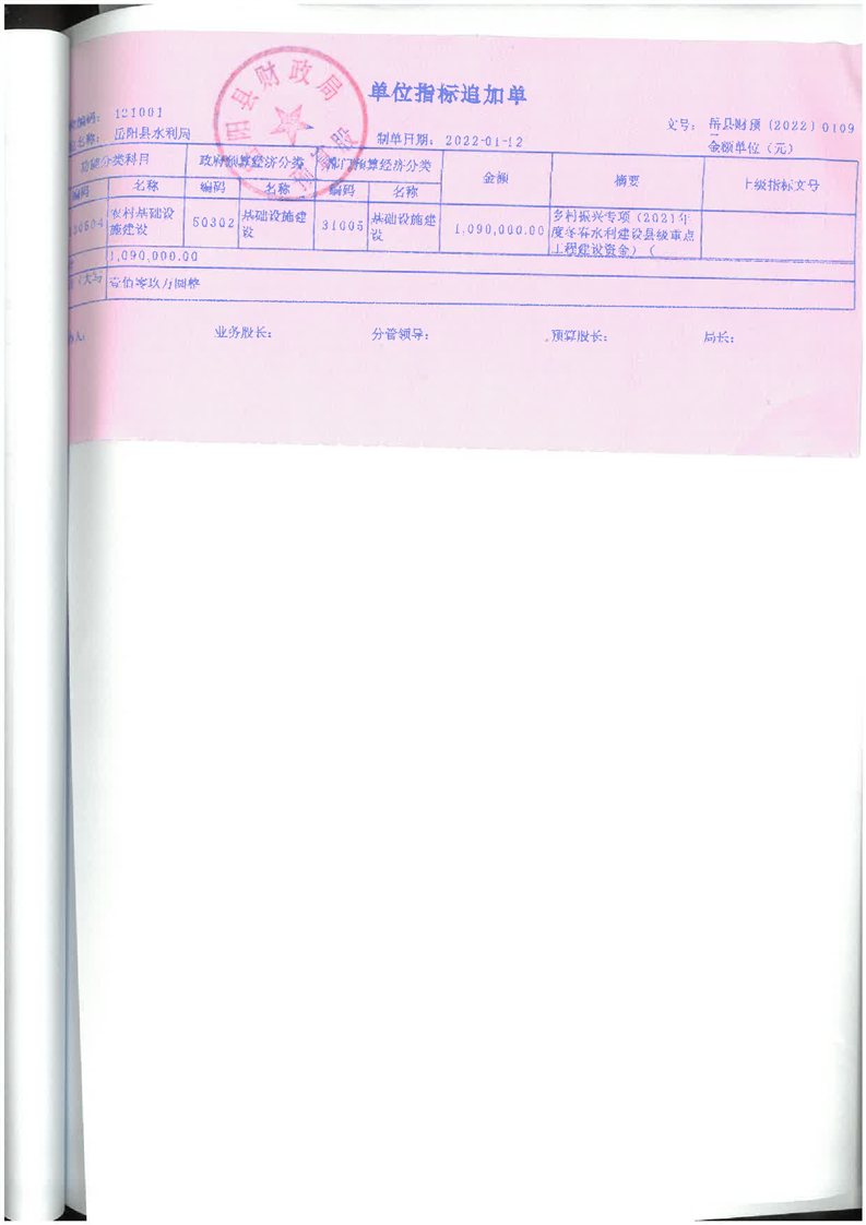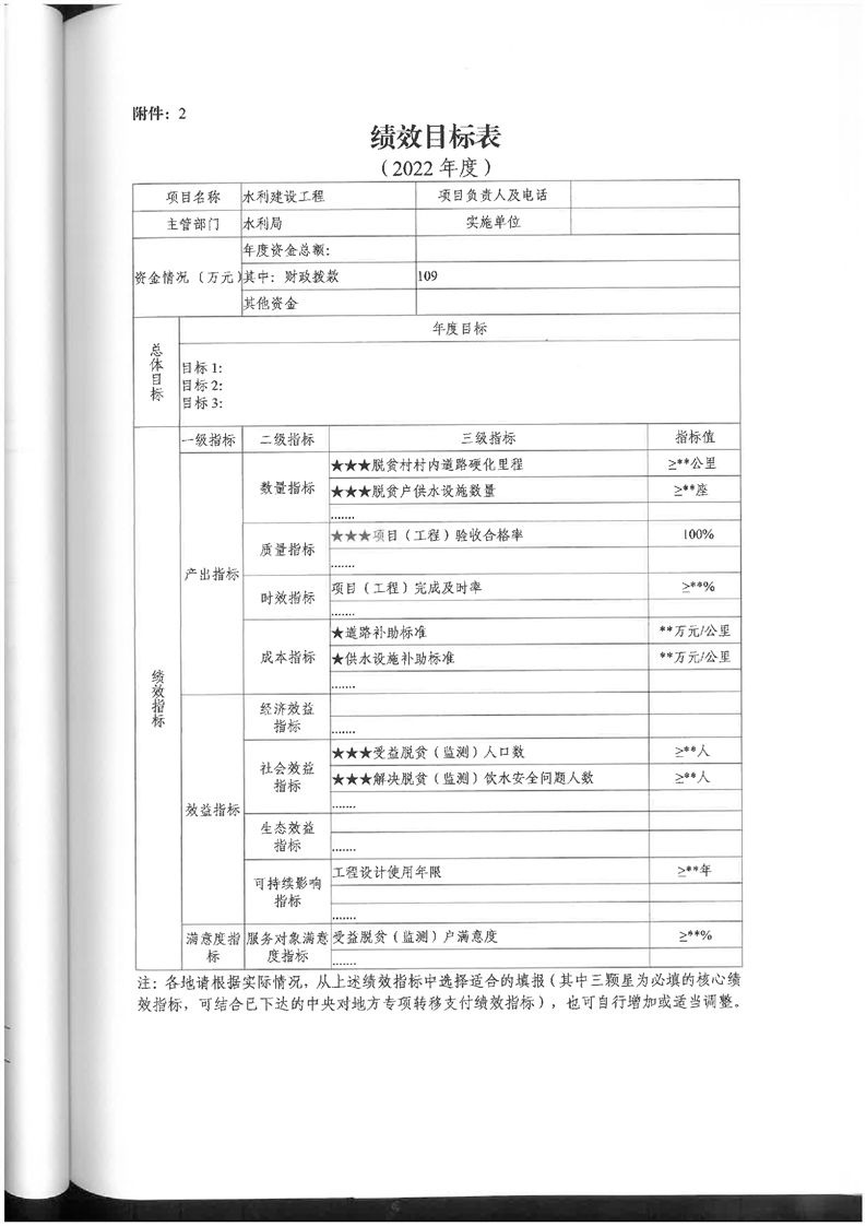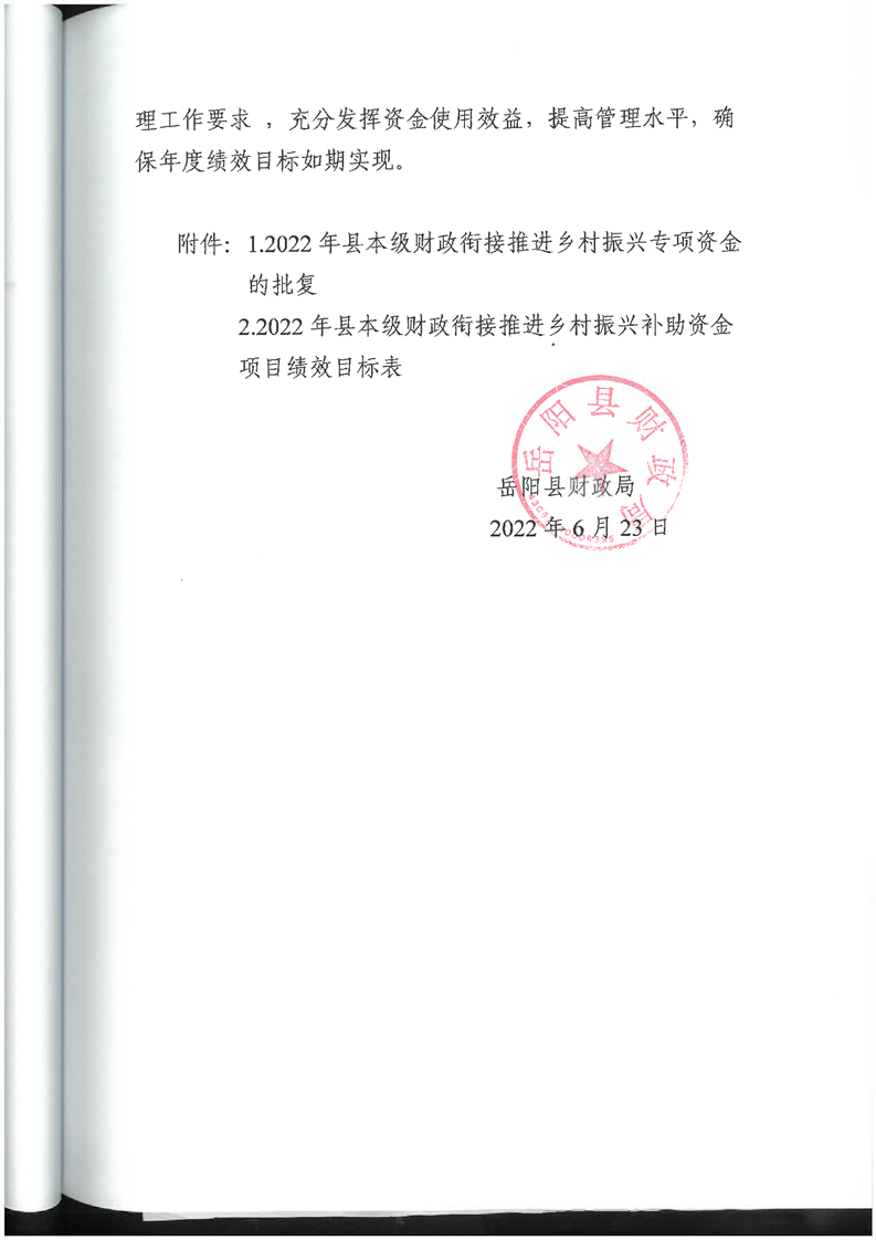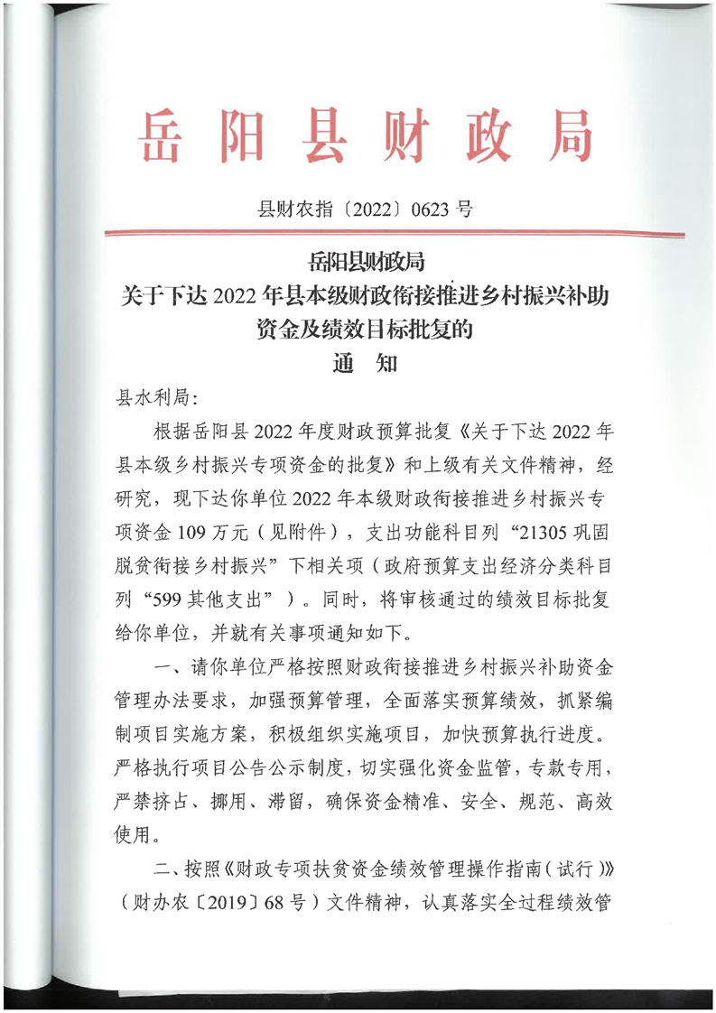 嶽陽縣財政局關於下達2022年縣本級財政銜接推進鄉村振興補助資金及績效目標批複(水利局109)公開公示