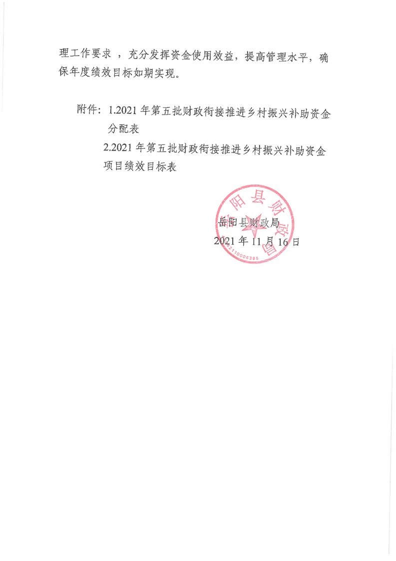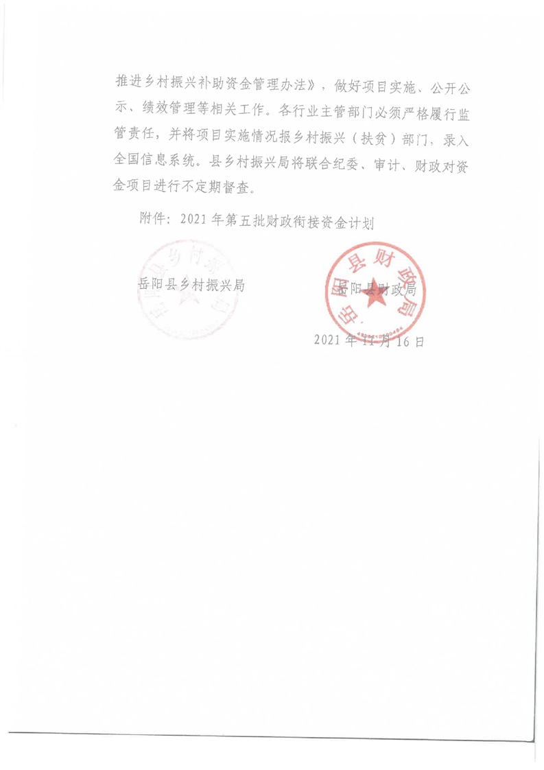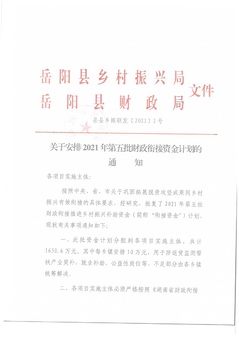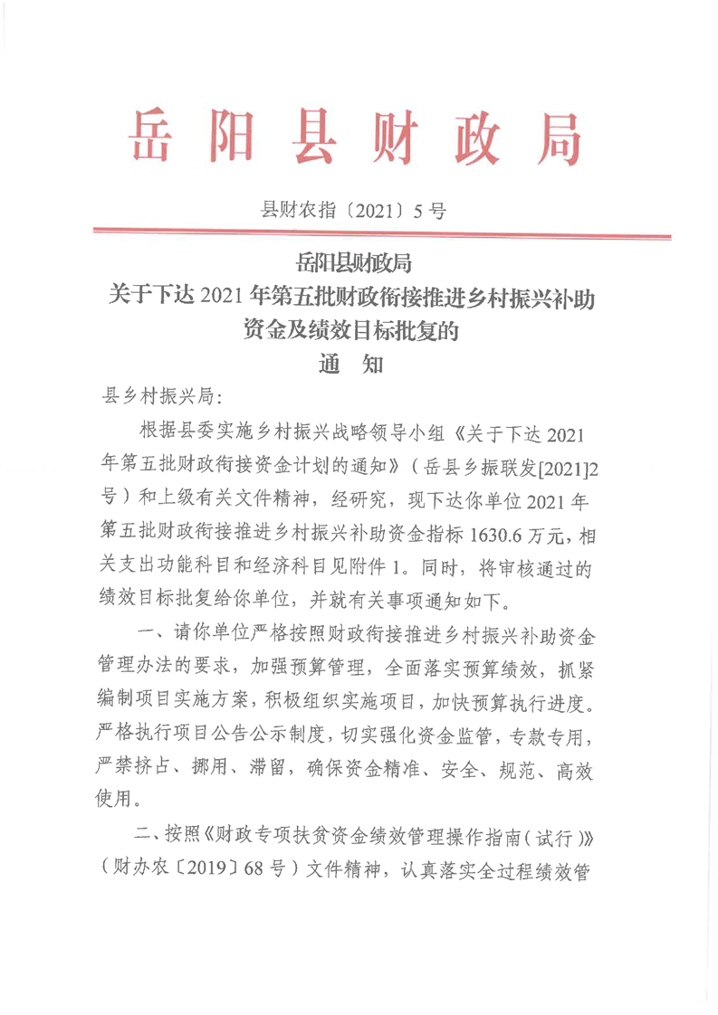 嶽陽縣財政局2021年關於下達第五批財政銜接推進鄉村振興資金及績效目標批複公開公示