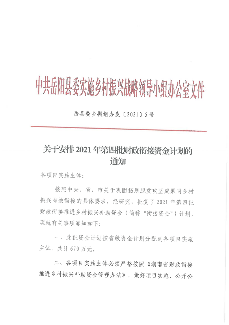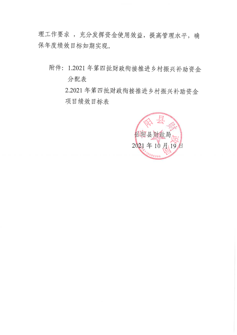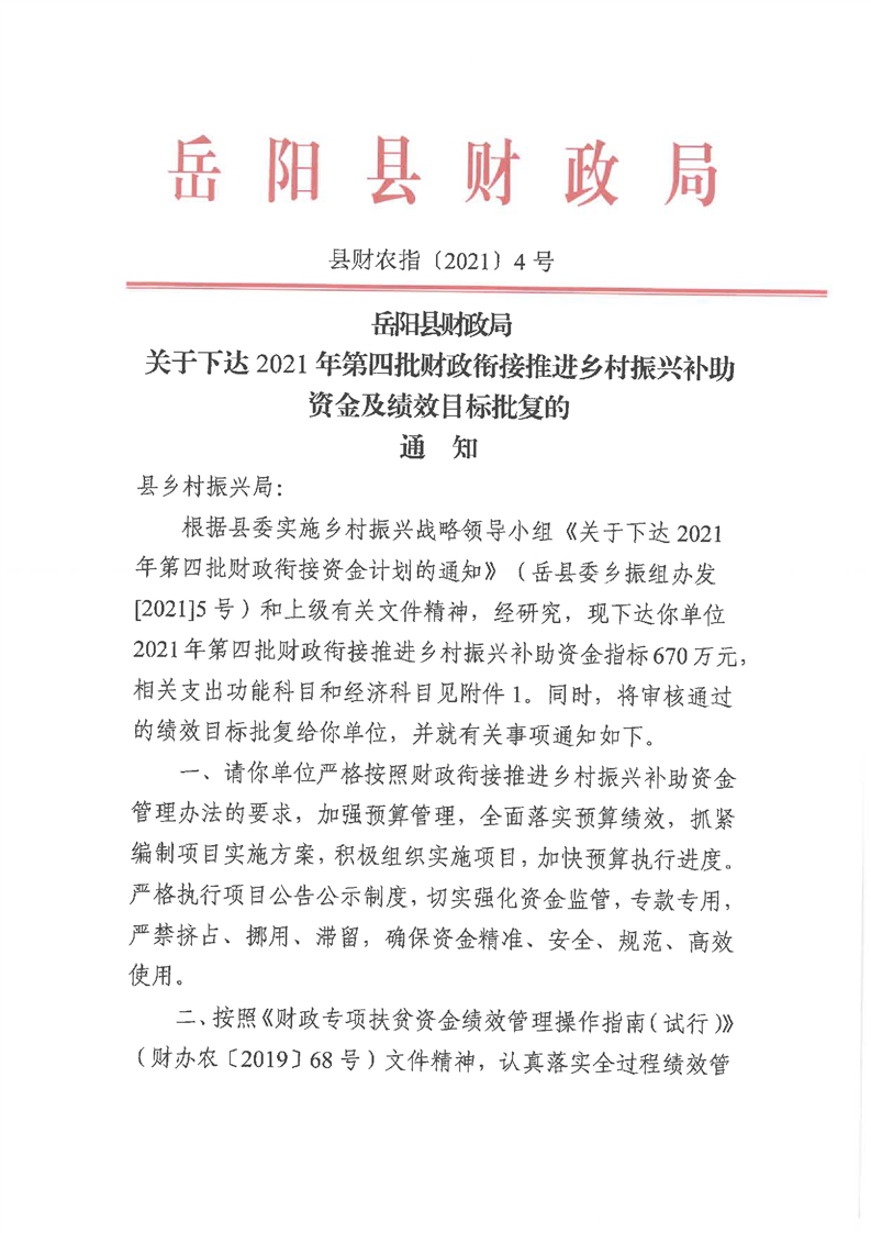 嶽陽縣財政局2021年關於下達第四批財政銜接推進鄉村振興資金及績效目標批複公開公示