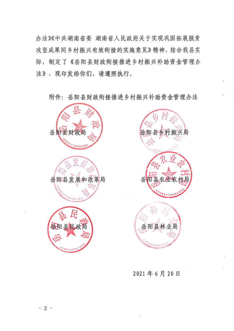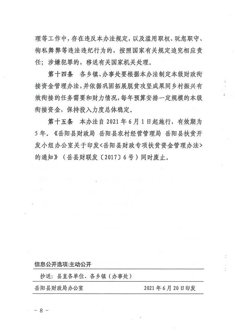 關於印發《嶽陽縣財政銜接推進鄉村振興補助資金管理辦法》的通知公開公示