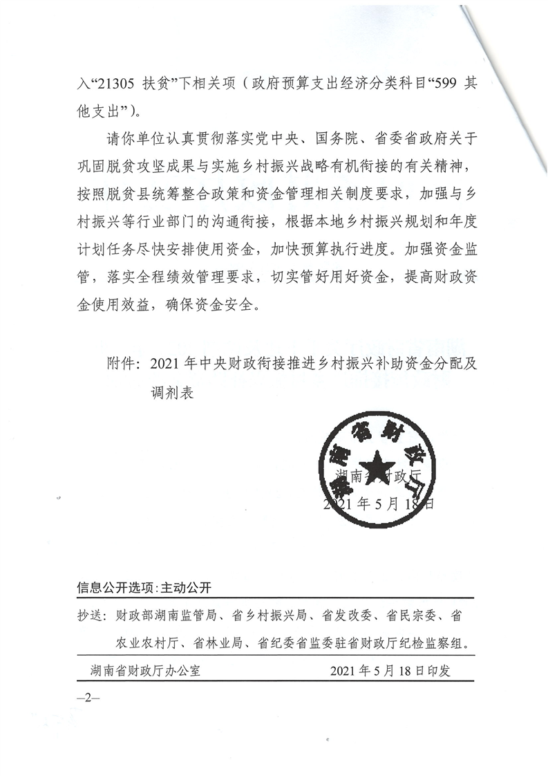 湖南省財政廳下達及調劑2021年中央財政銜接推進鄉村振興補助資金公開公示