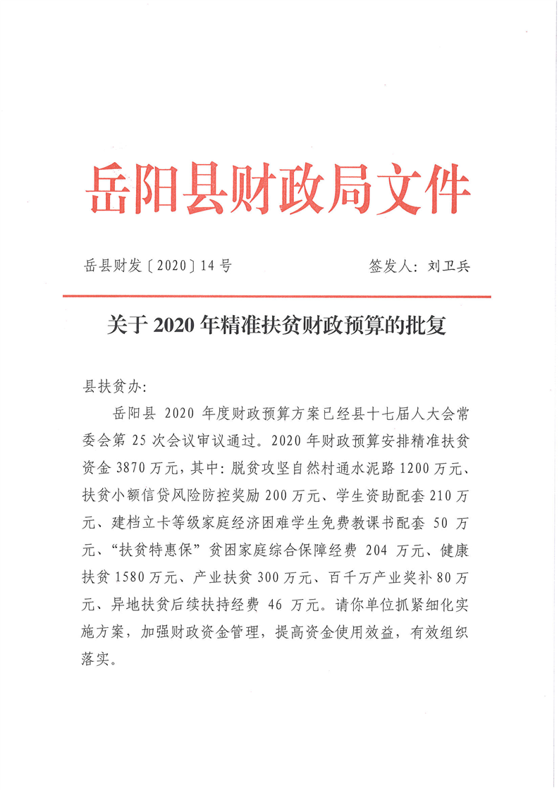 嶽陽縣2020年度本級財政扶貧專項預算公開公示