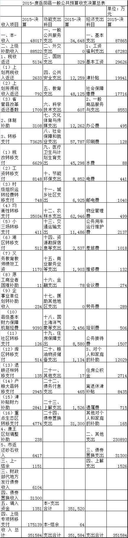 2015年度嶽陽縣一般公共預算收支決算總表