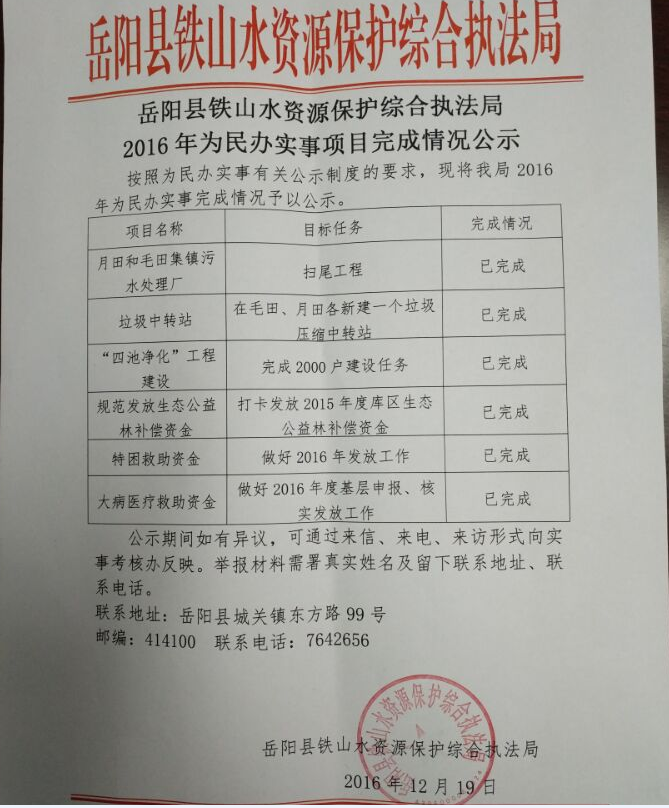 嶽陽縣鐵山水資源保護綜合執法局2016年為民辦實事項目完成情況公示