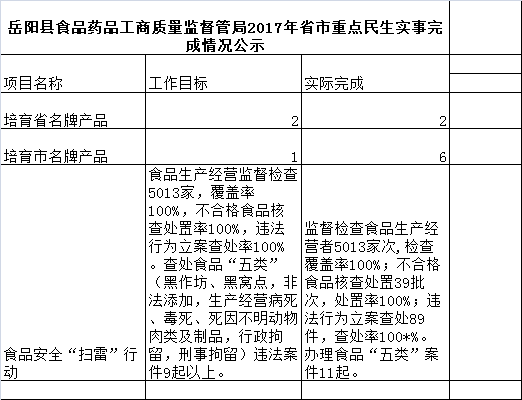 嶽陽縣食品藥品工商質量監督管理局2017年省市重點民生實事完成情況公示