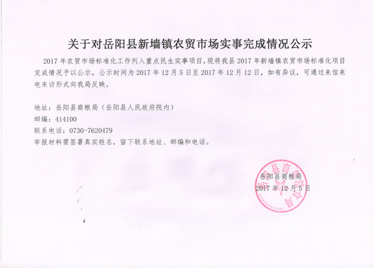 關於對嶽陽縣新牆農貿市場實事完成情況公示