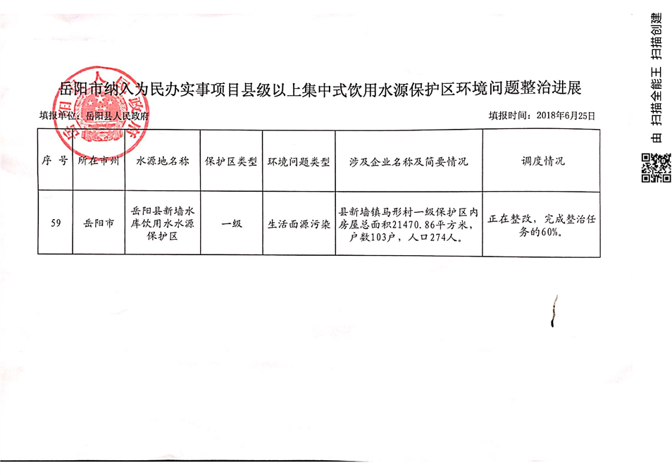 嶽陽市納入為民辦實事項目縣級以上集中式飲用水源保護區環境問題整治進展