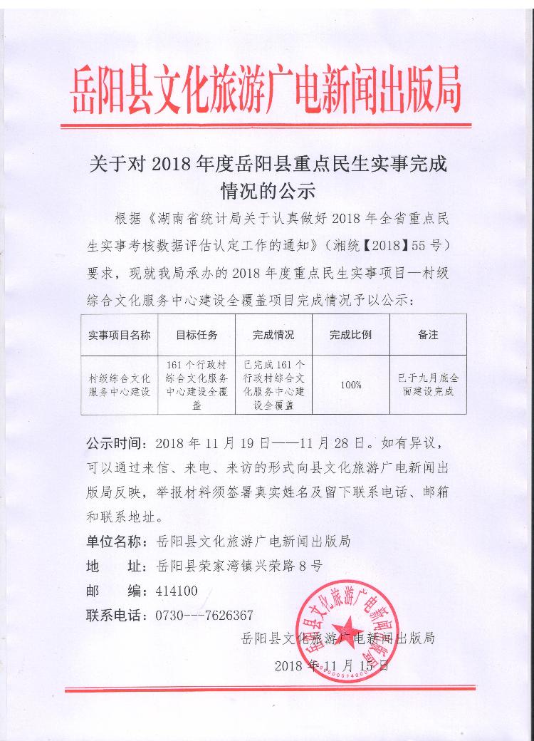 關於對2018年度嶽陽縣重點民生實事完成情況的公示