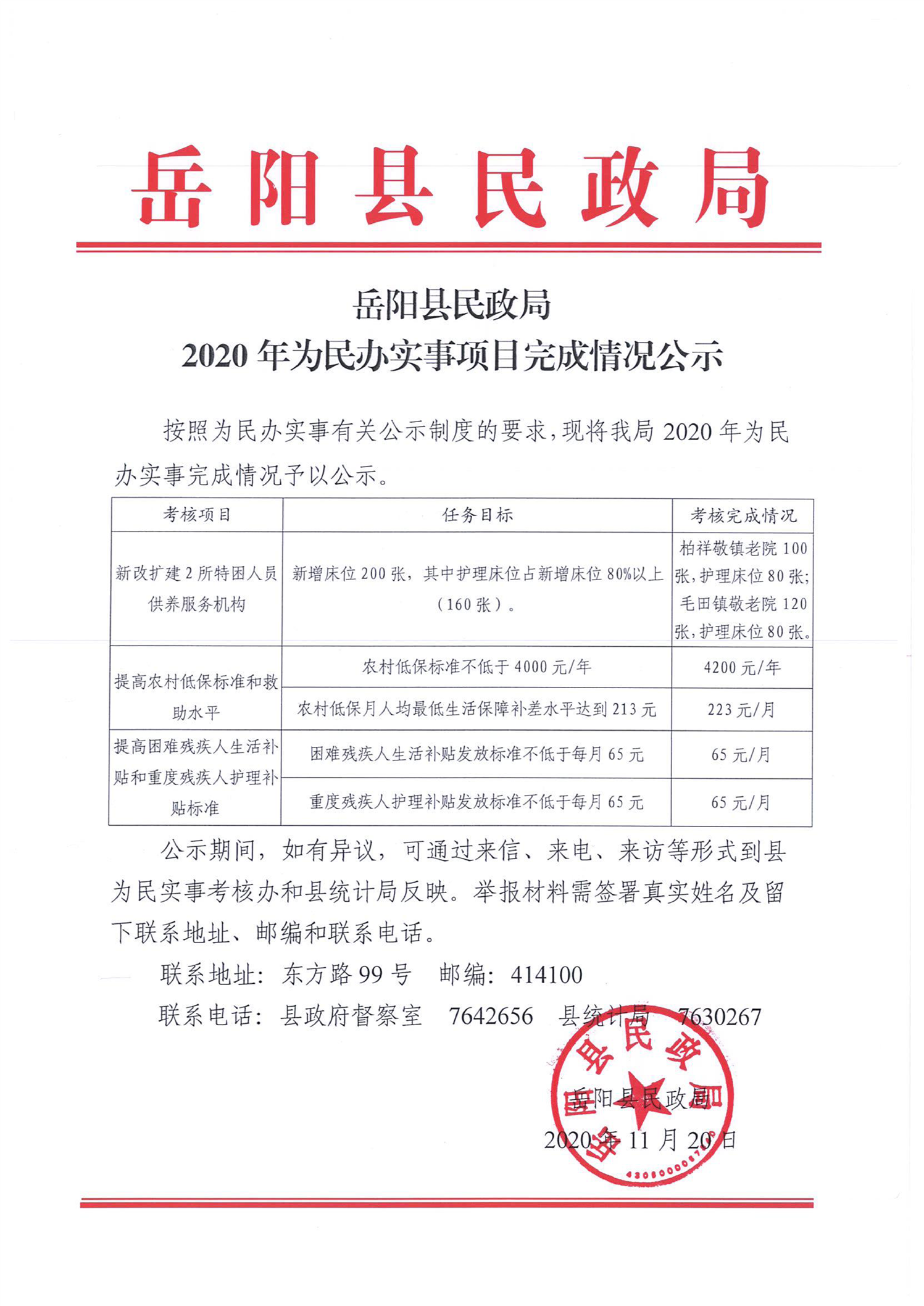 嶽陽縣民政局2020年為民辦實事項目完成情況公示