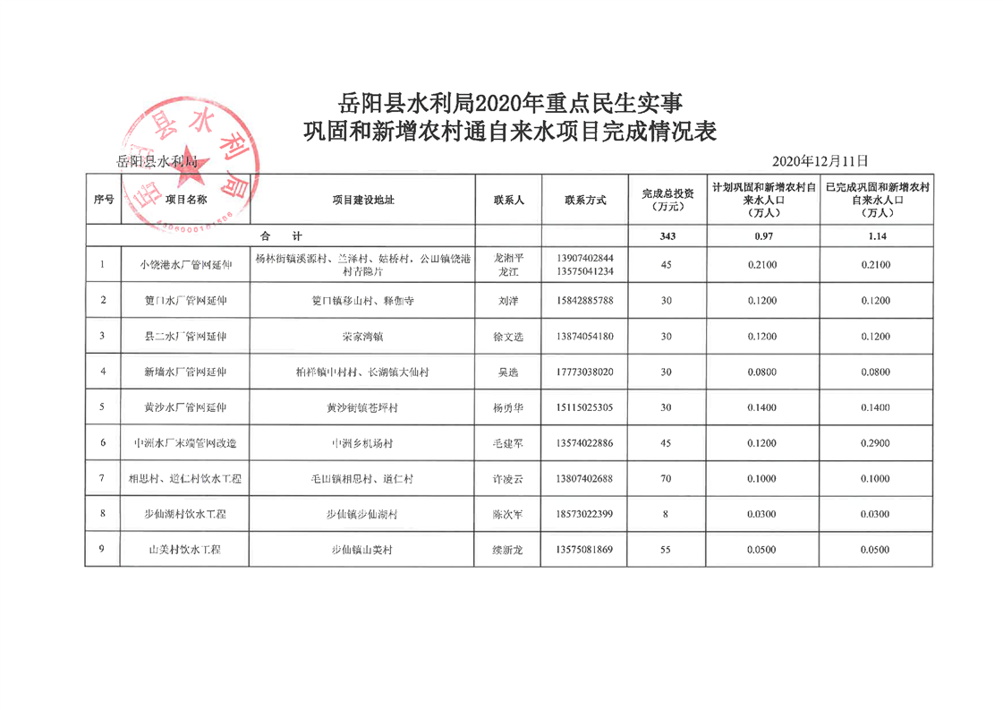 嶽陽縣水利局2020年重點民生實事鞏固和新增農村通自來水項目完成情況