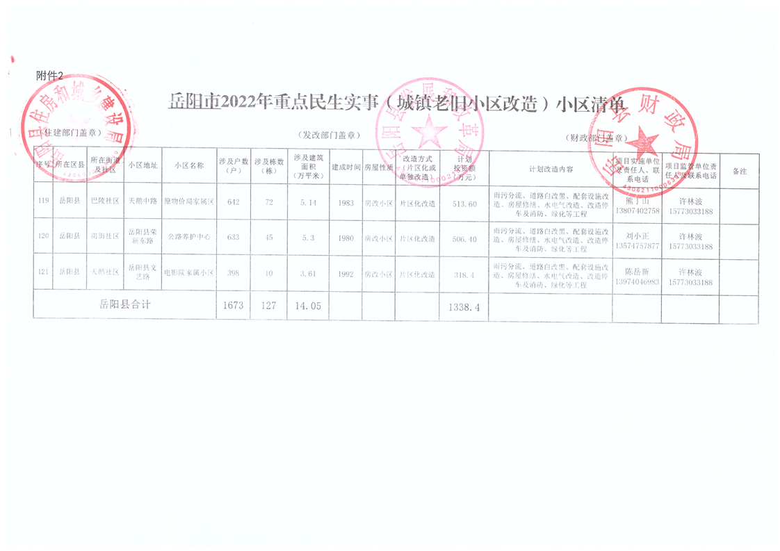 嶽陽縣2022年重點民生實事(城鎮老舊小區改造)項目清單