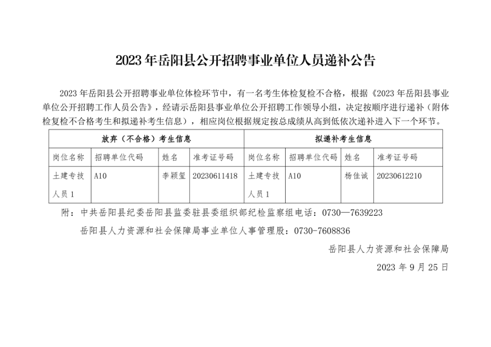 2023年嶽陽縣公開招聘事業單位人員遞補公告