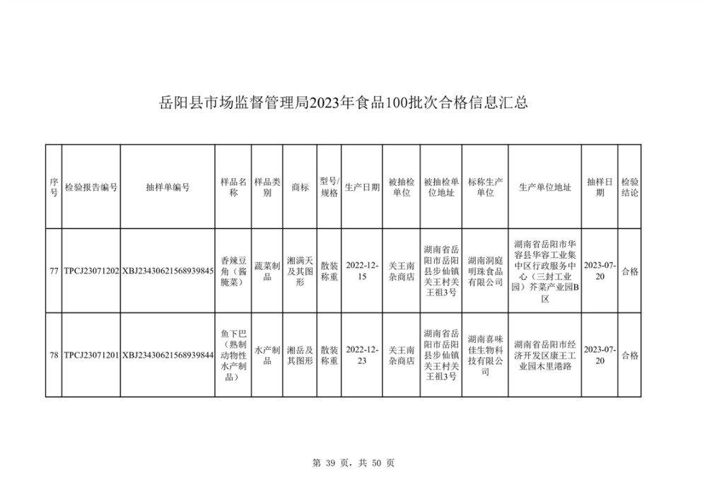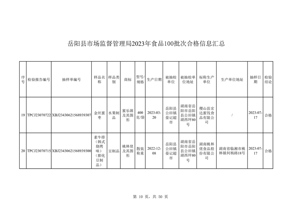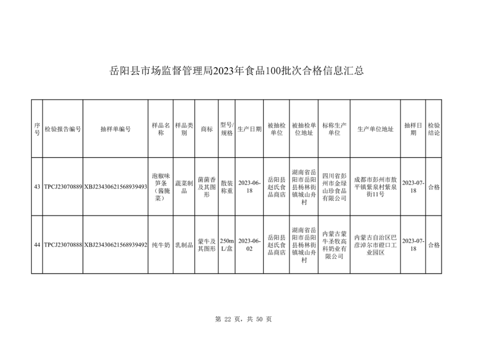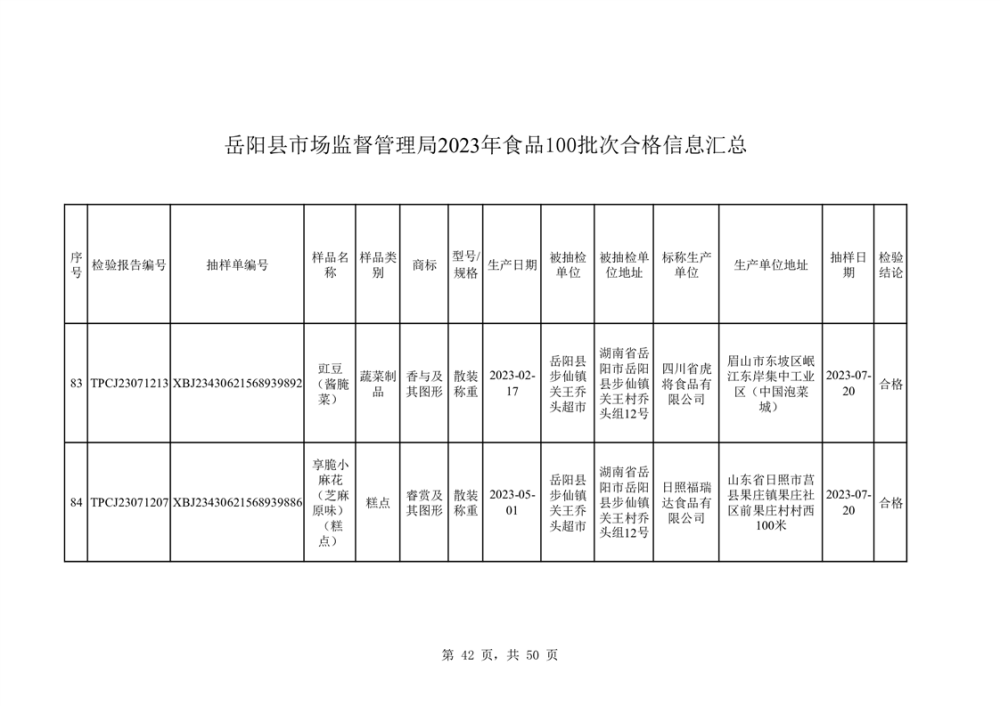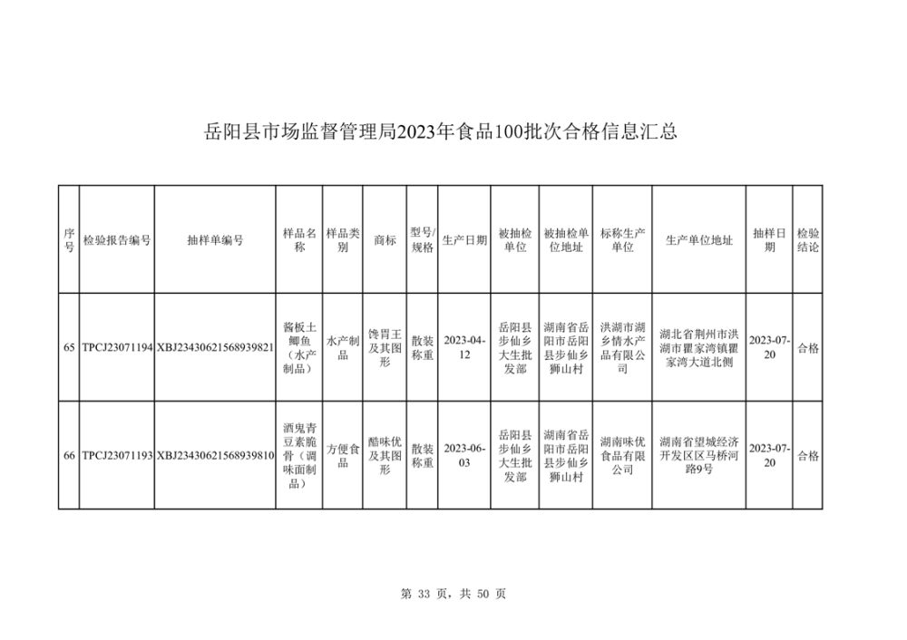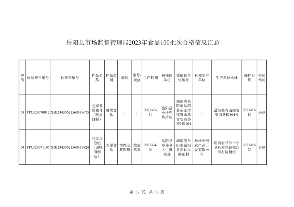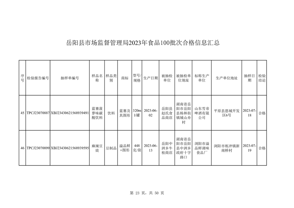 2023年嶽陽縣市場監督管理局食品合格信息匯總(100批次)