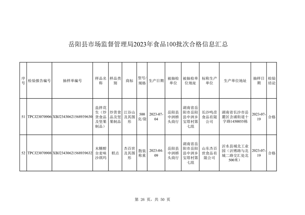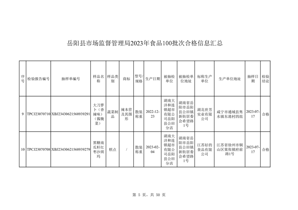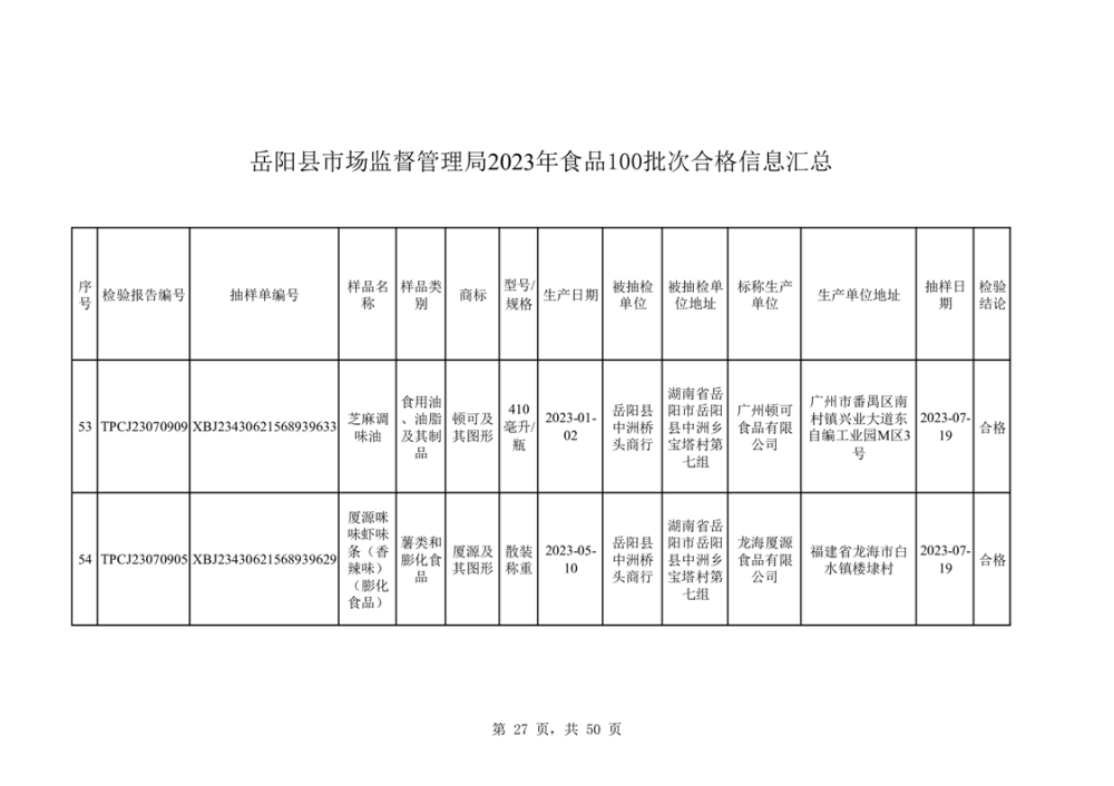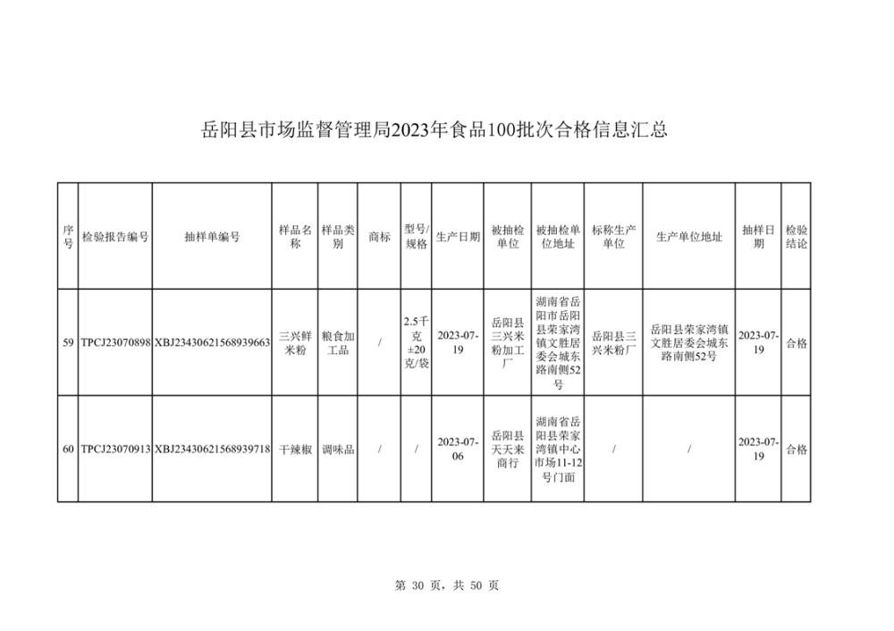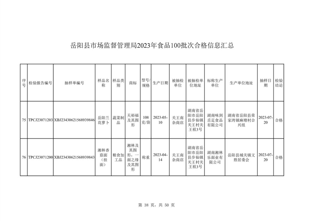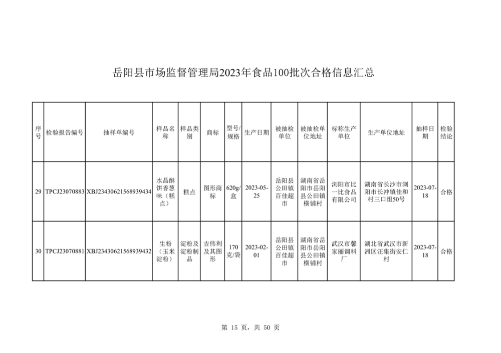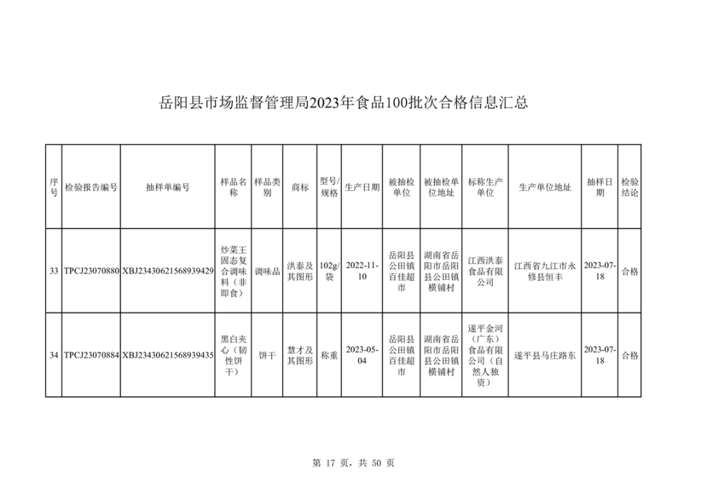 2023年嶽陽縣市場監督管理局食品合格信息匯總(100批次)