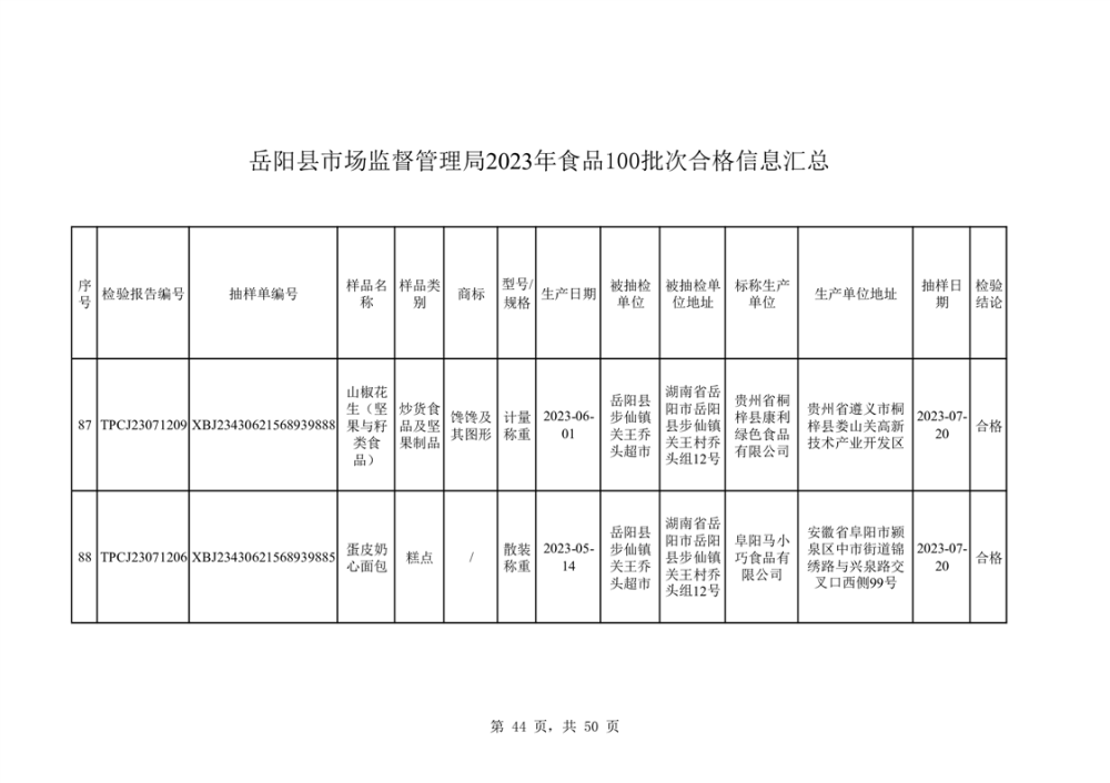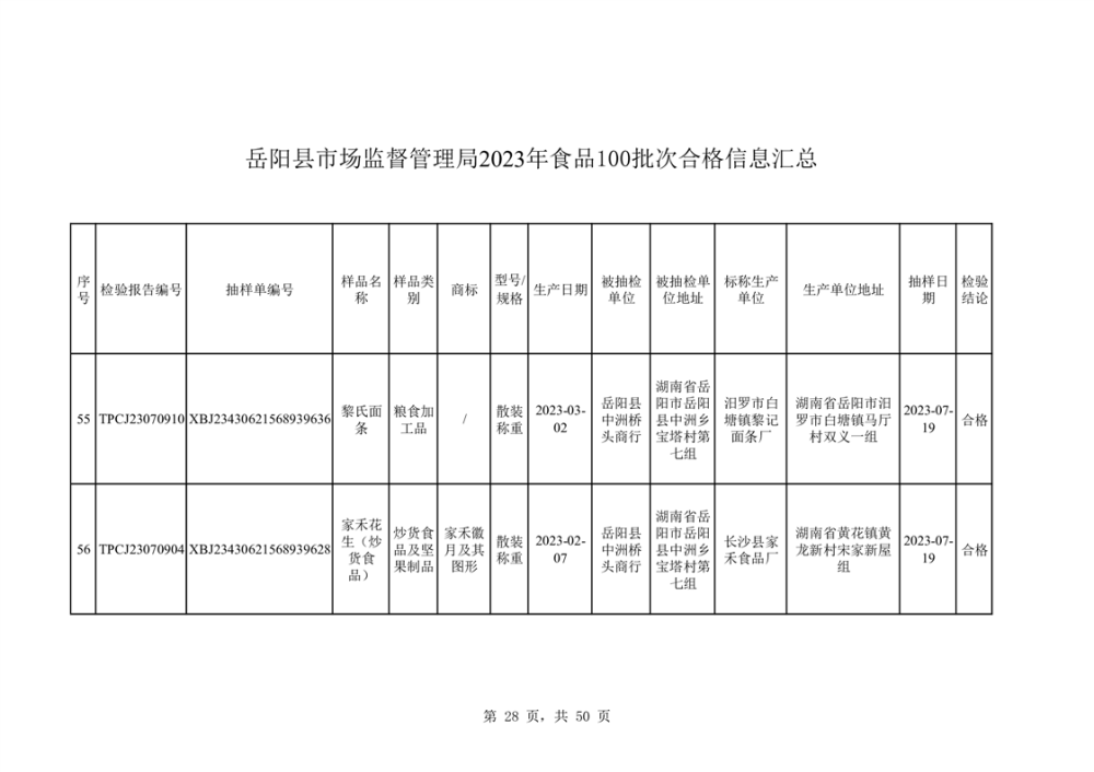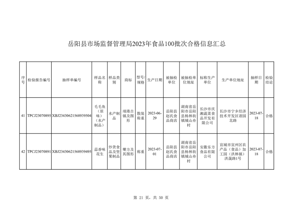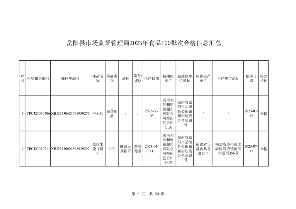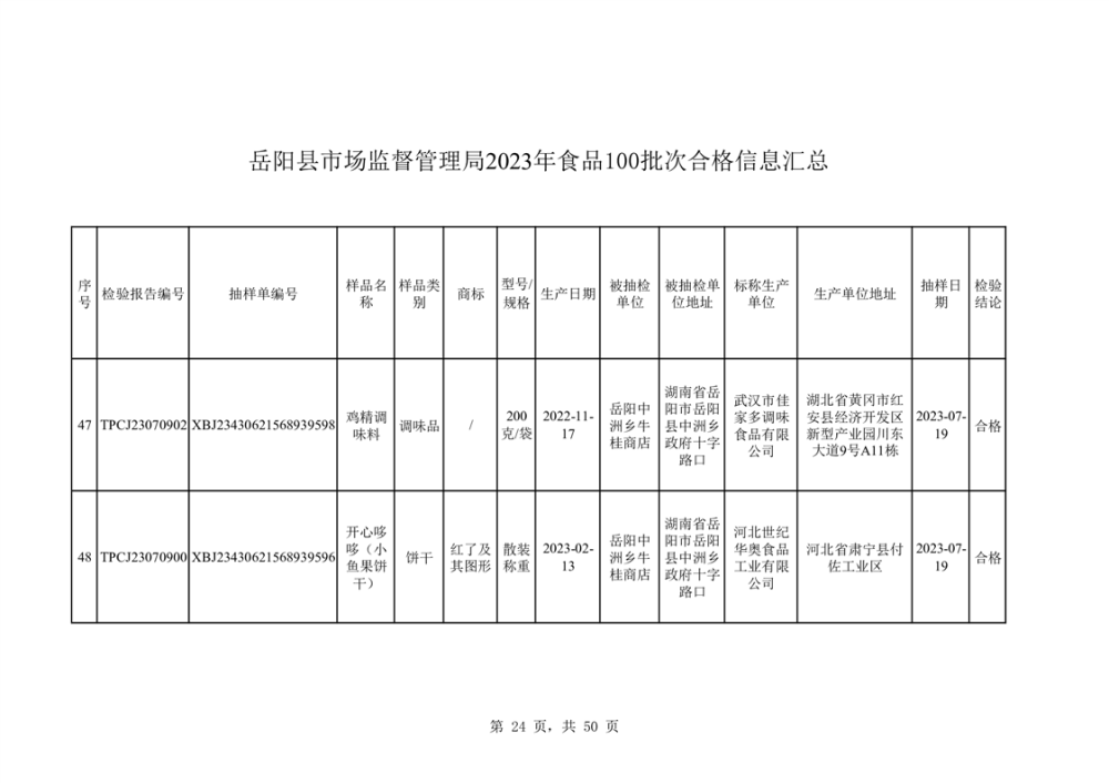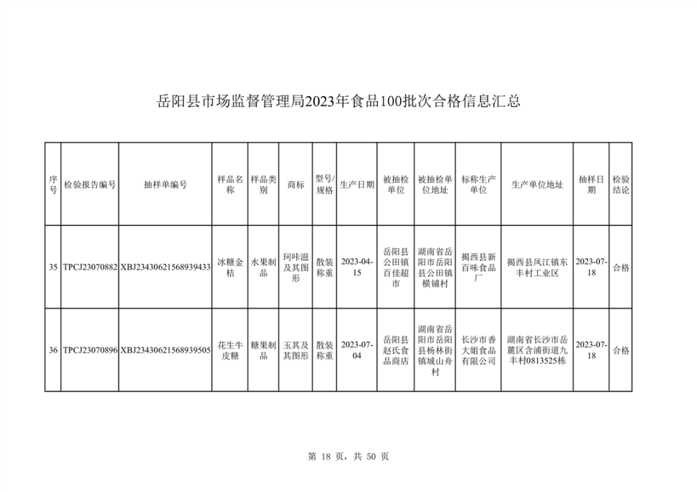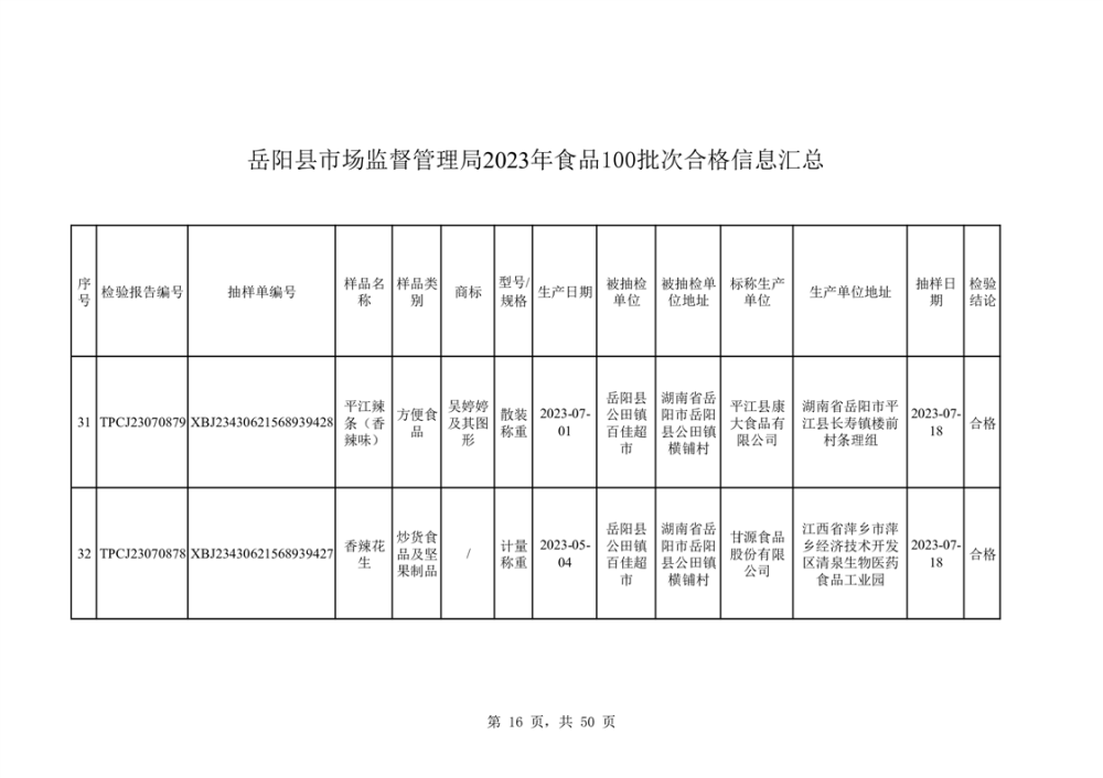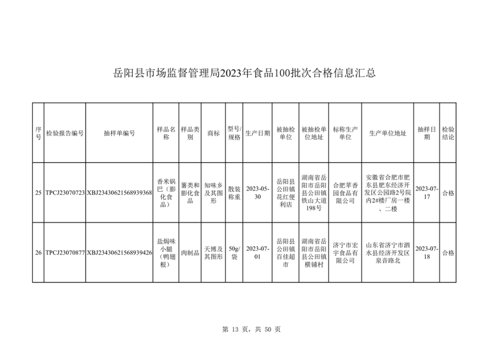 2023年嶽陽縣市場監督管理局食品合格信息匯總(100批次)