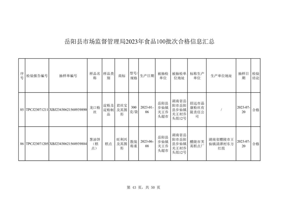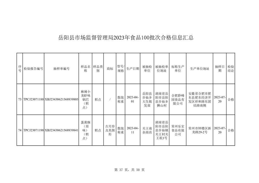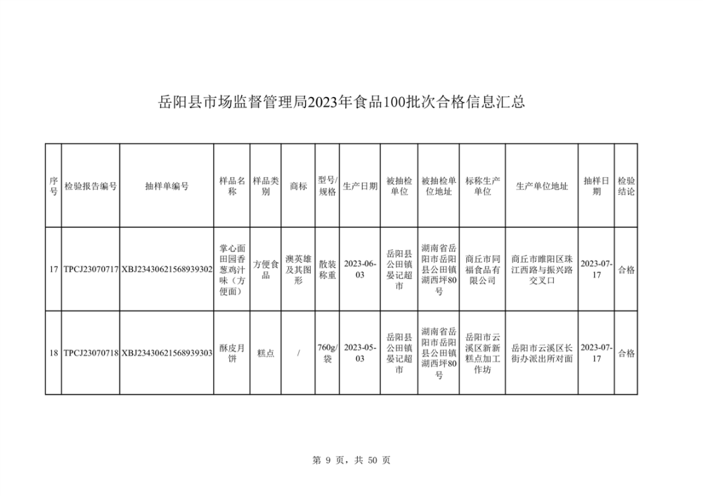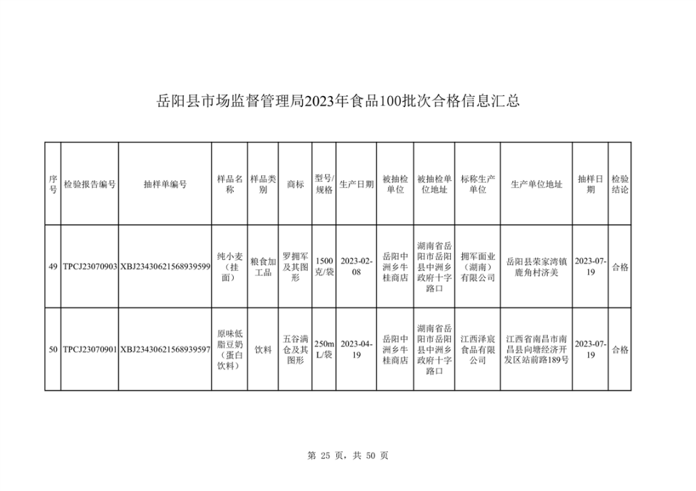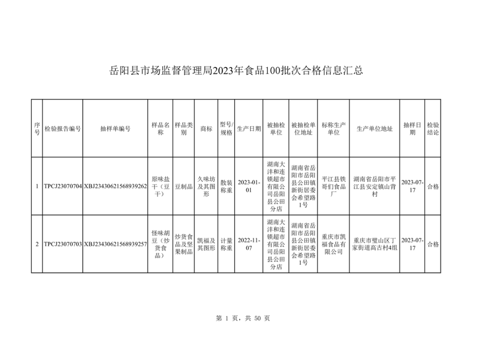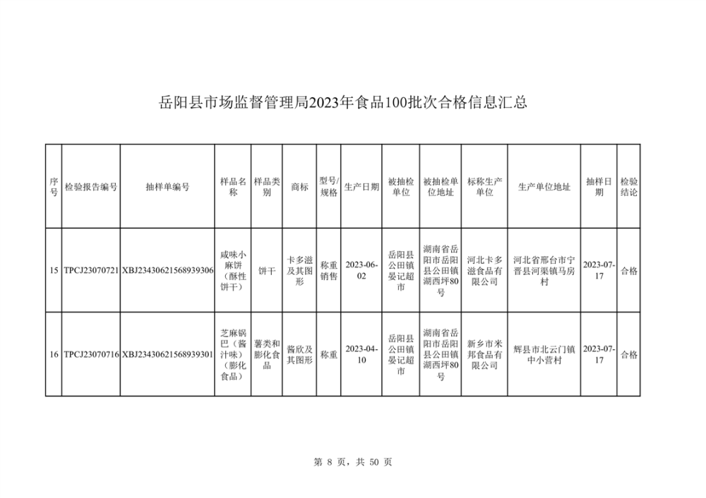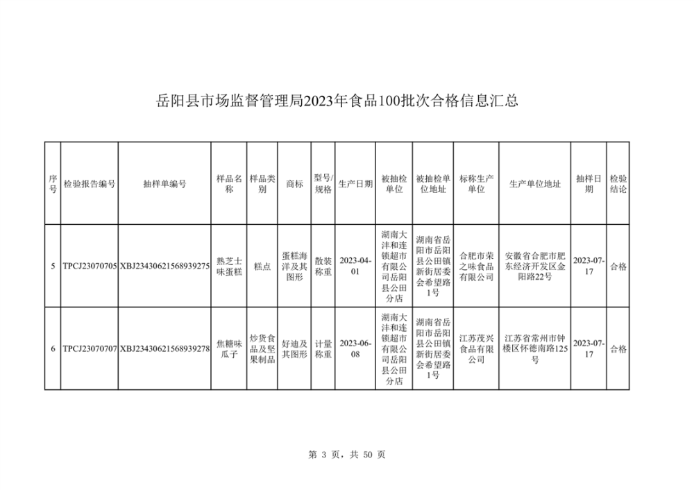2023年嶽陽縣市場監督管理局食品合格信息匯總(100批次)