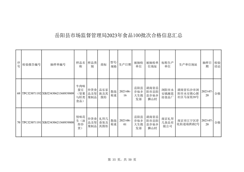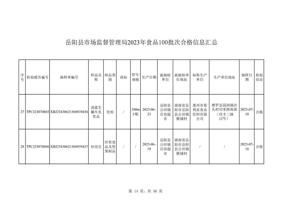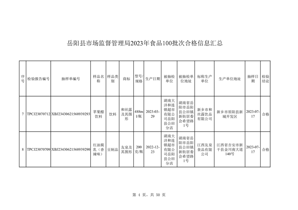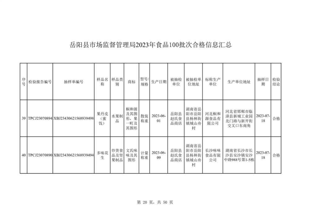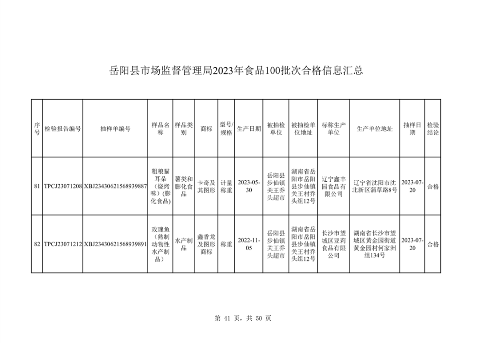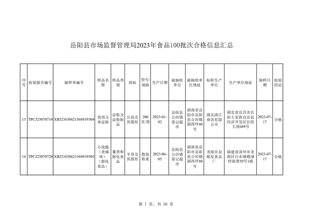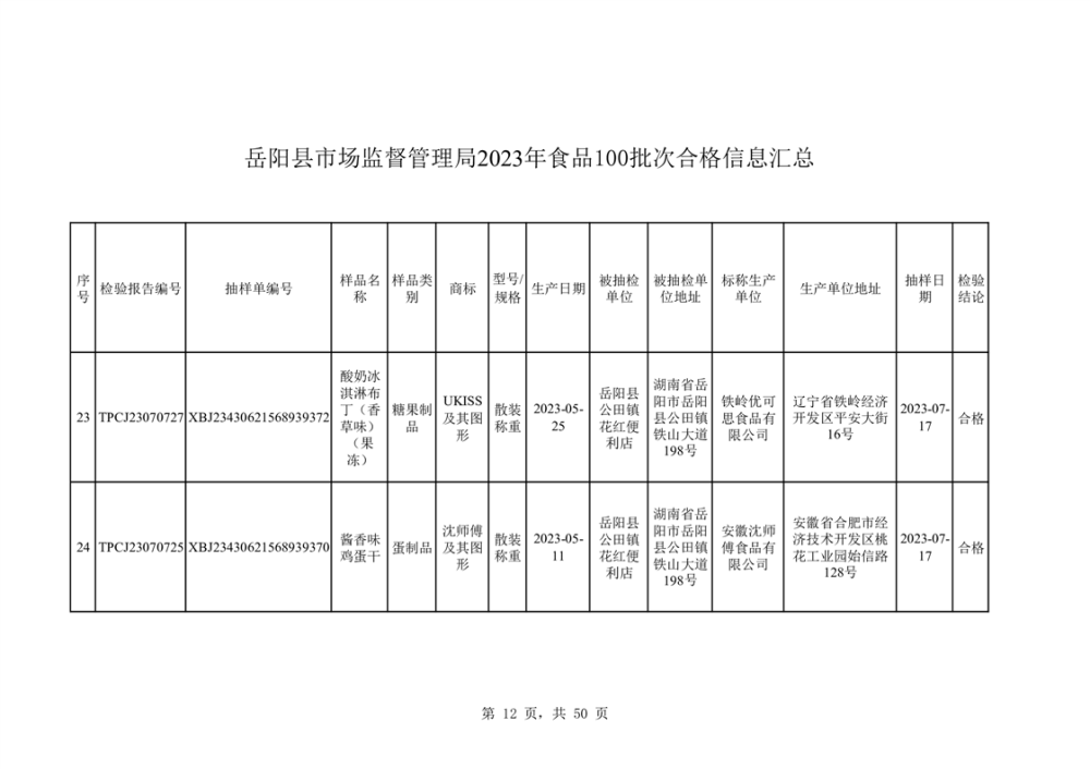 2023年嶽陽縣市場監督管理局食品合格信息匯總(100批次)