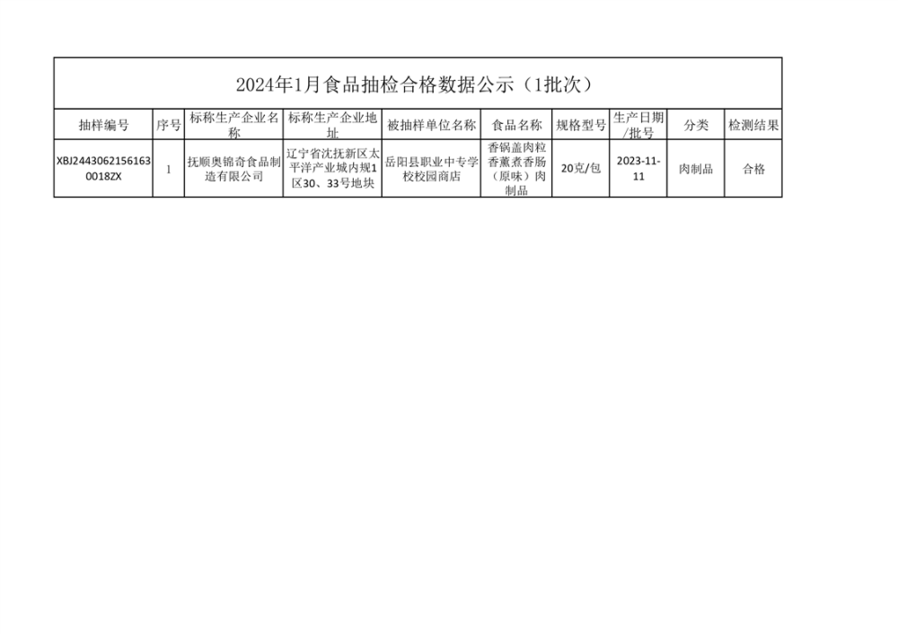 2024年1月食品抽檢合格數據公示(1批次)