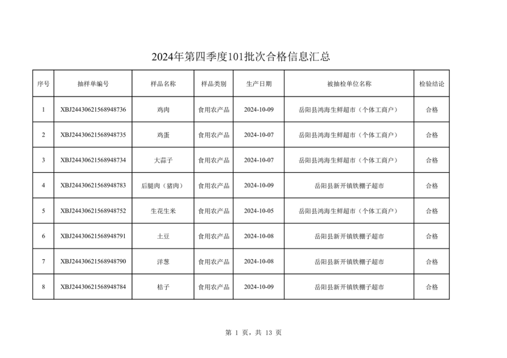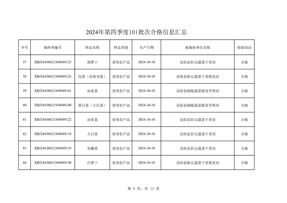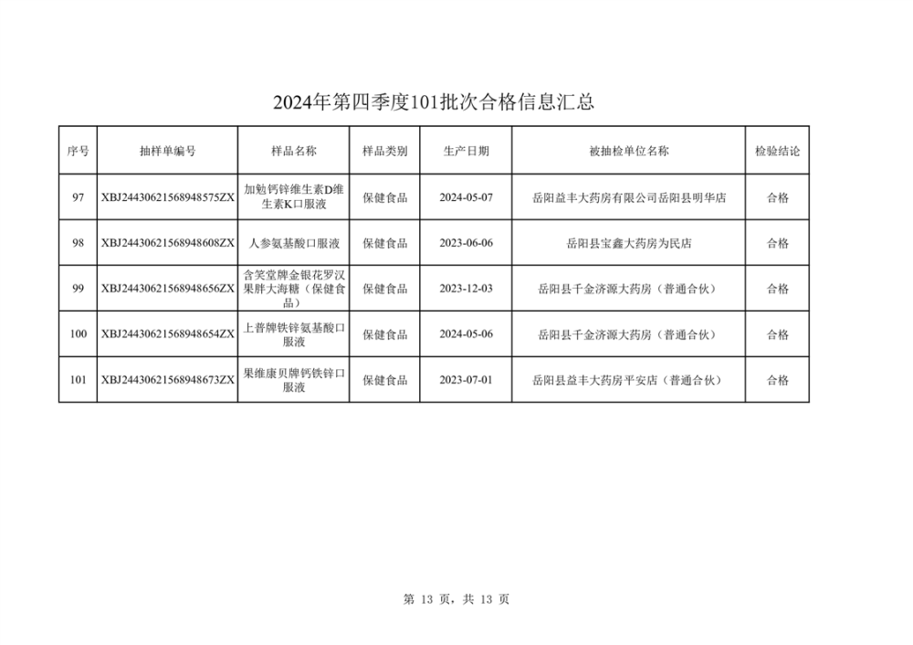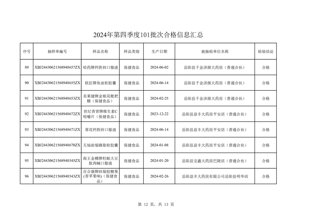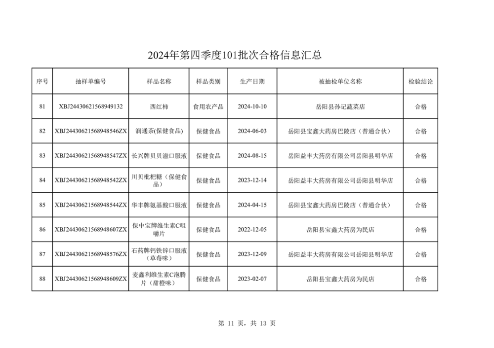 2024年第四季度抽檢結果匯總(合格101批次)