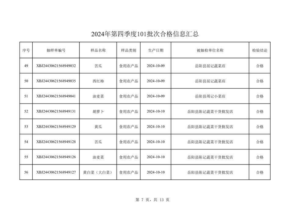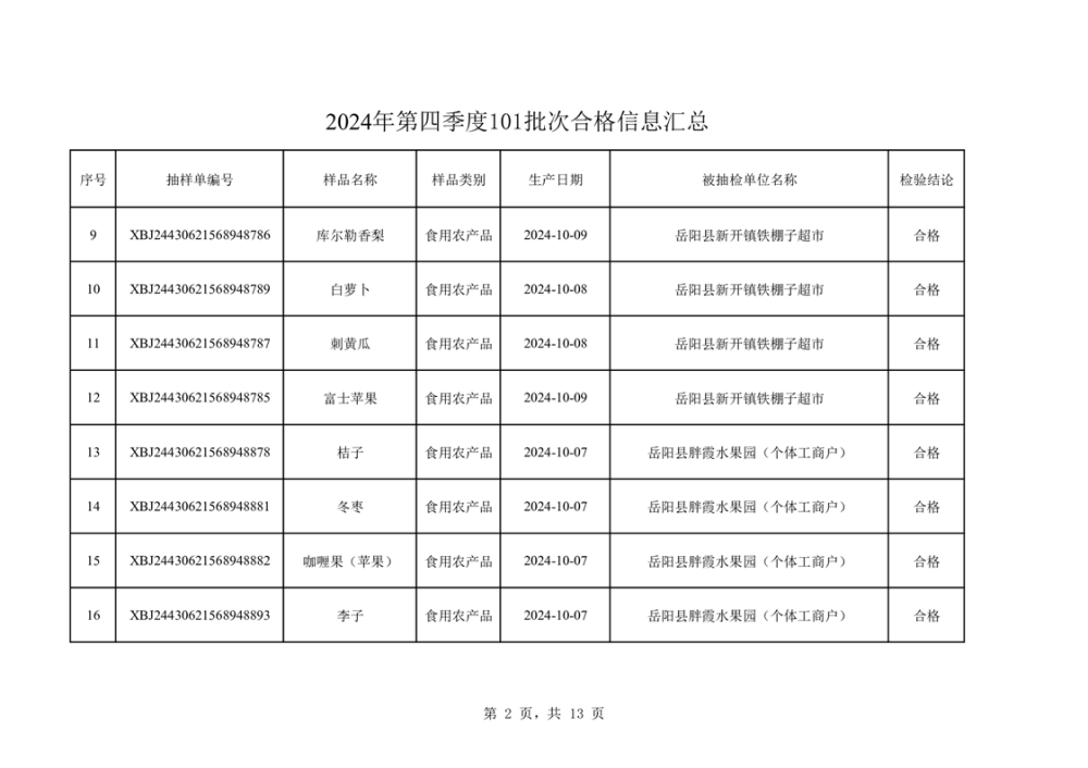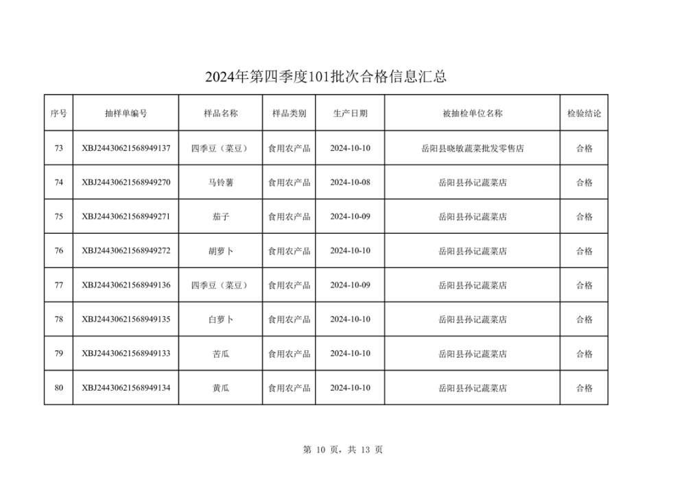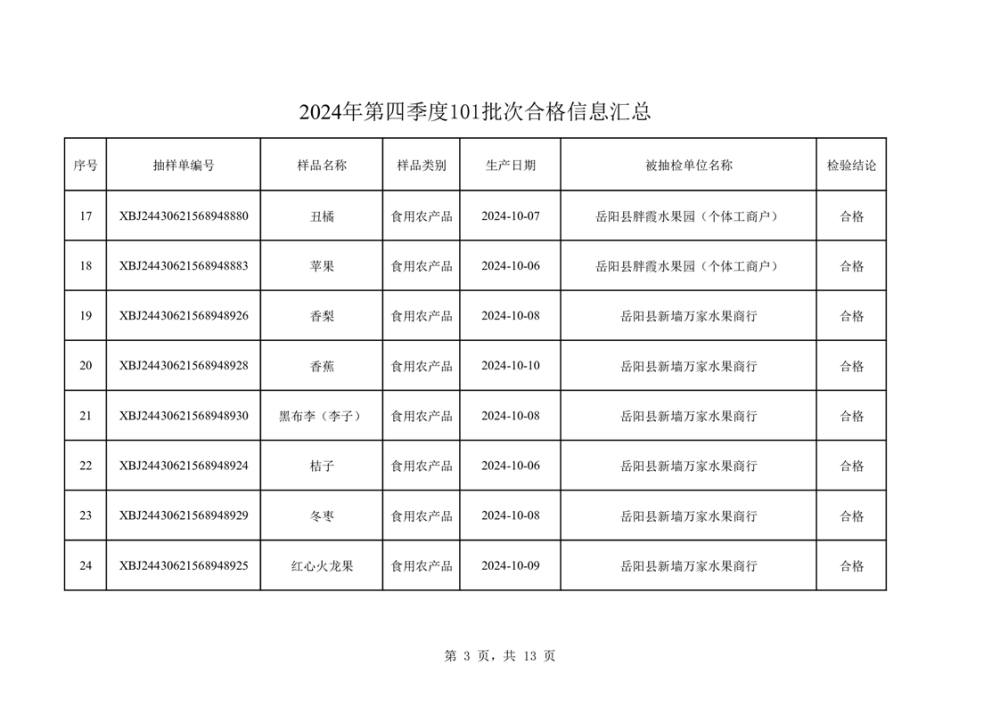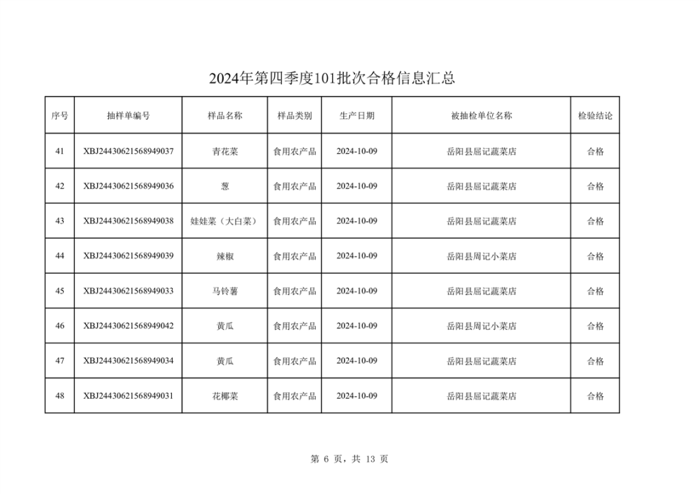 2024年第四季度抽檢結果匯總(合格101批次)