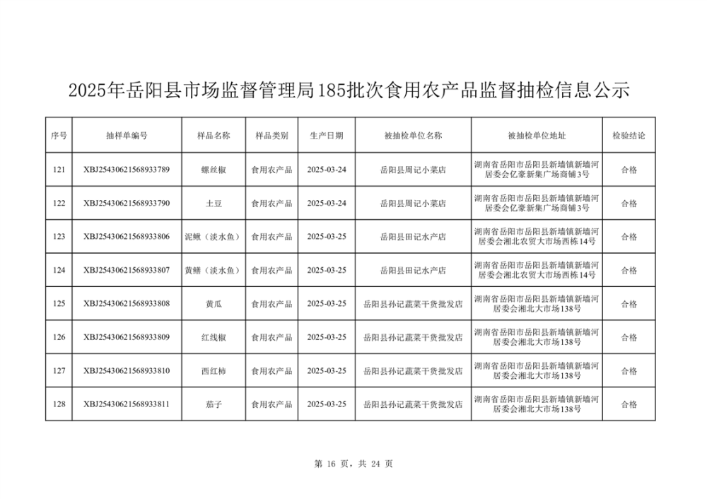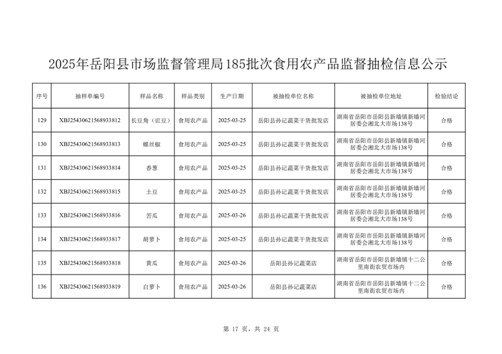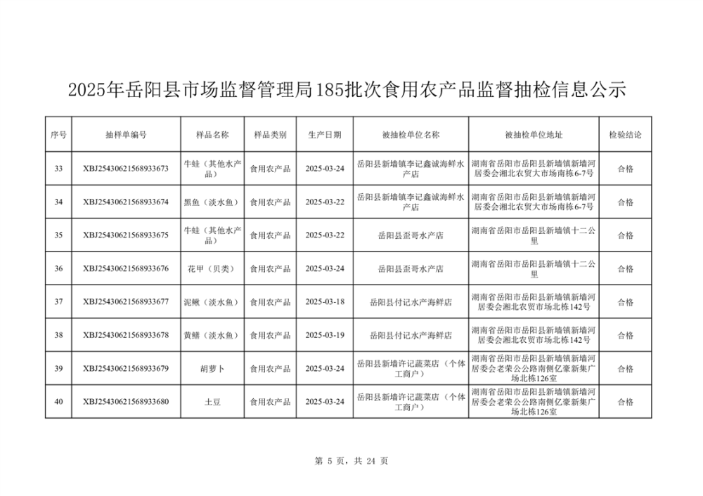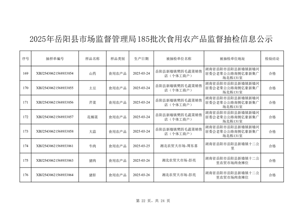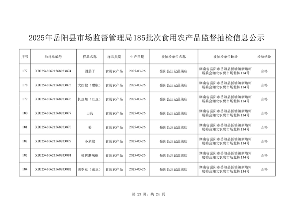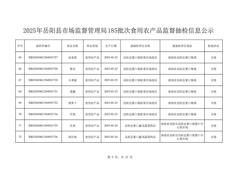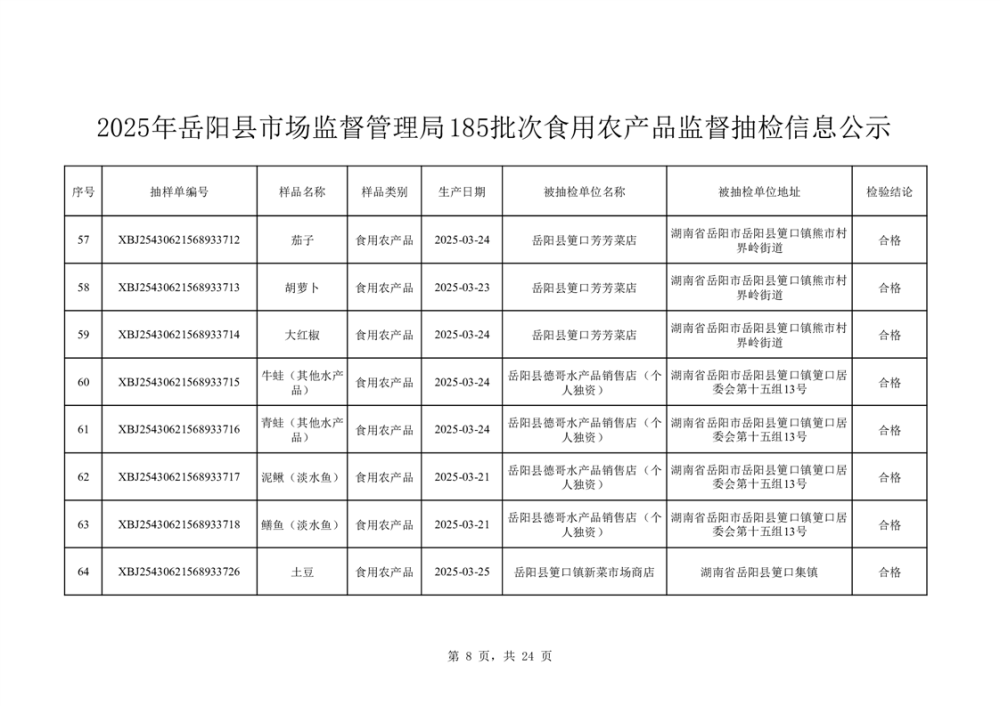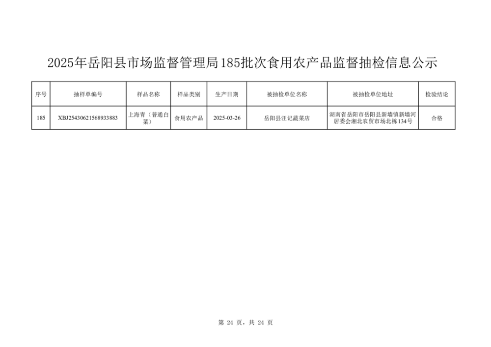 2025年嶽陽縣市場監督管理局185批次食用農產品監督抽檢信息公示(2025年5月12日)