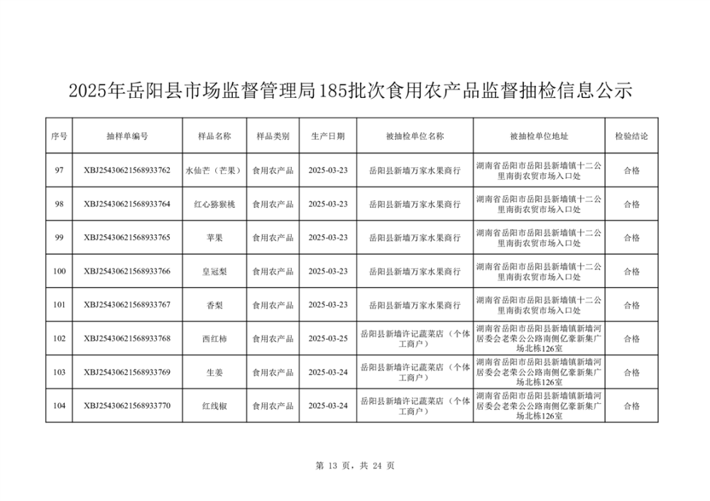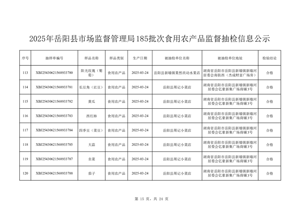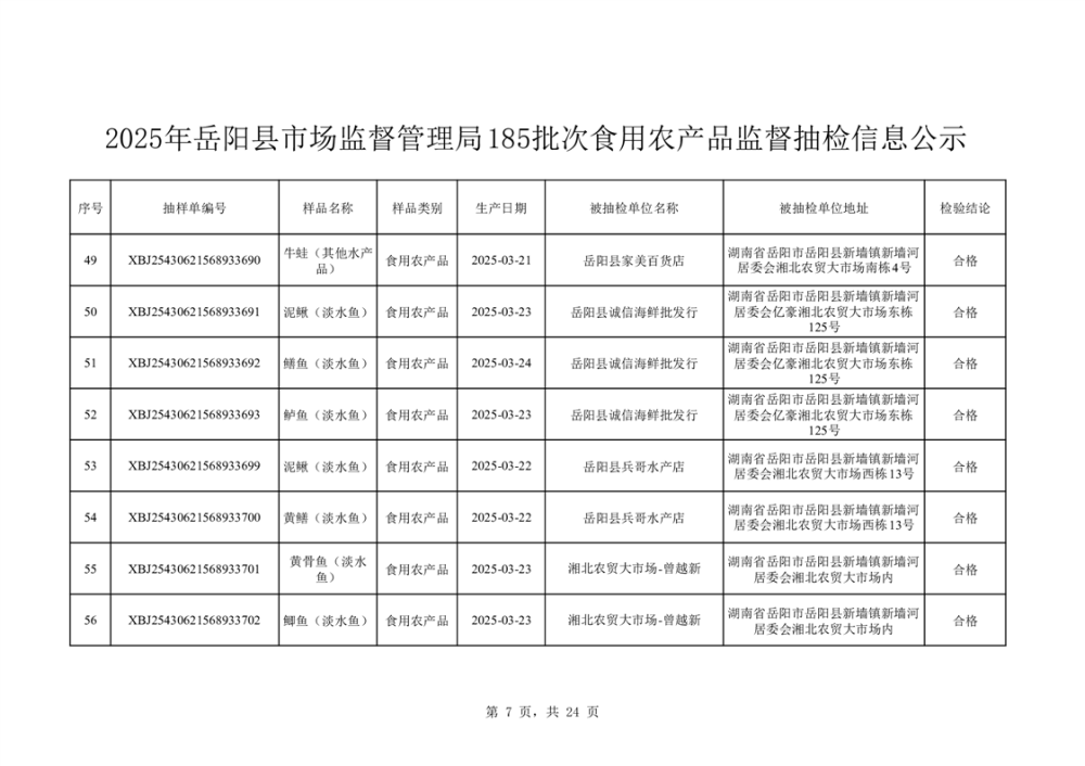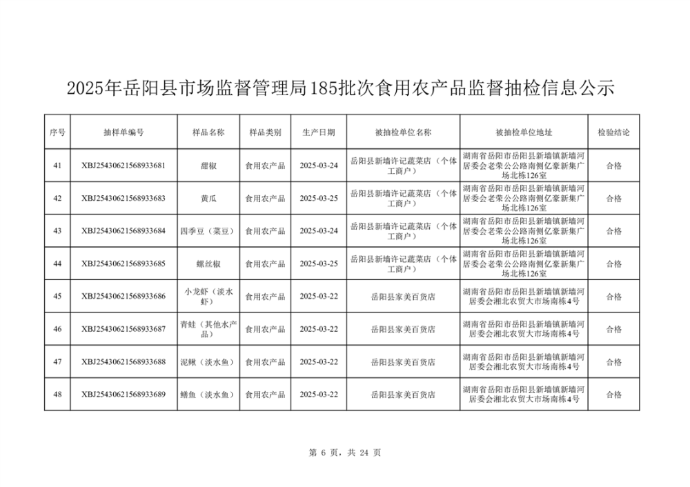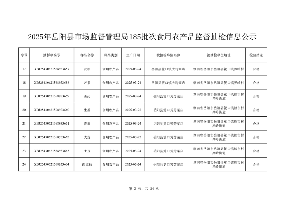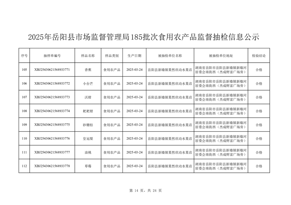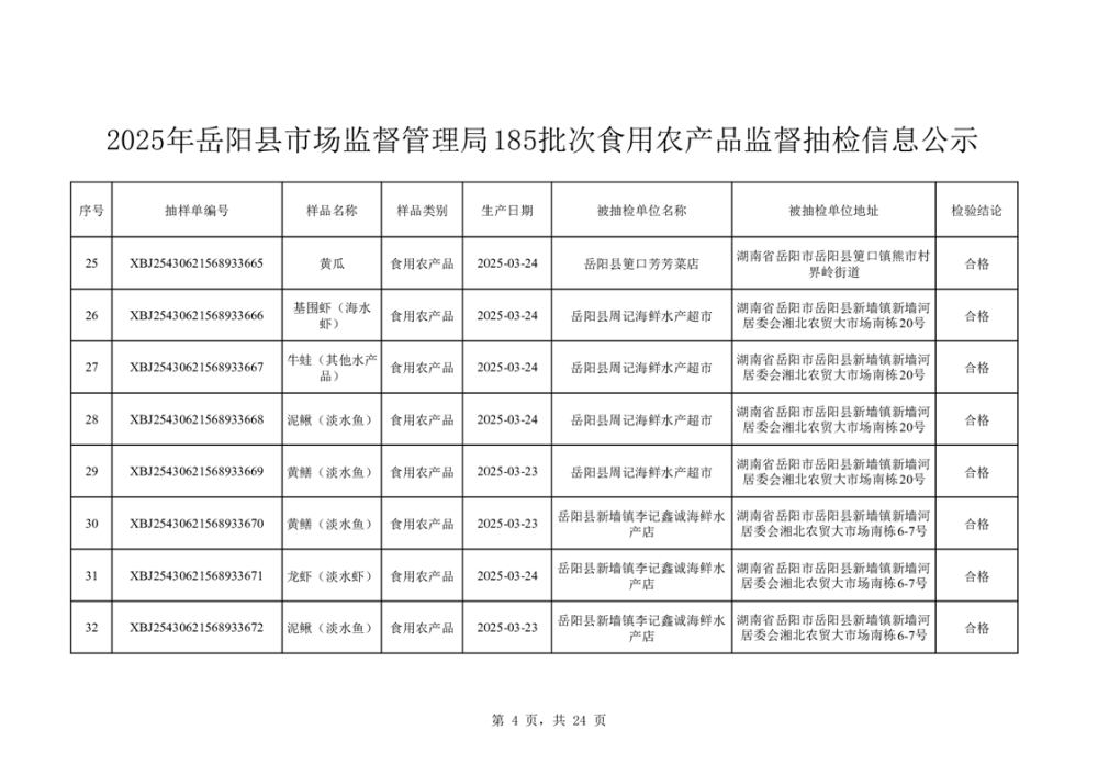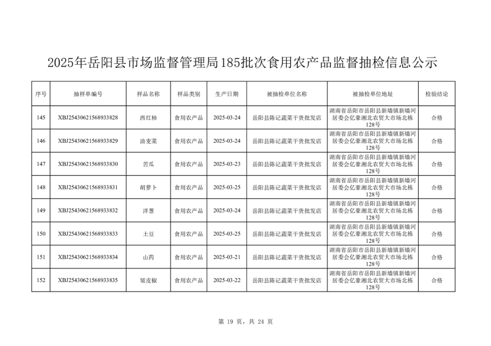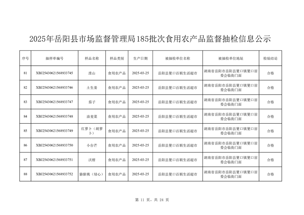 2025年嶽陽縣市場監督管理局185批次食用農產品監督抽檢信息公示(2025年5月12日)