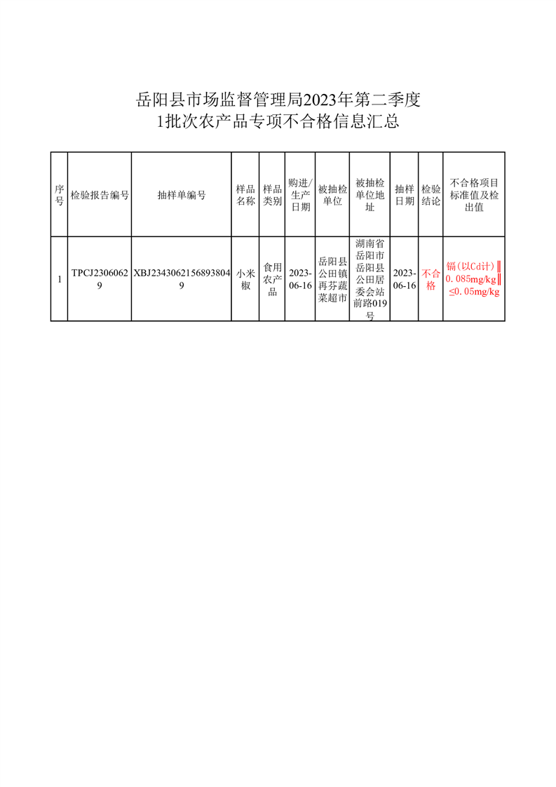 2023年第二季度農產品專項抽檢不合格品結果匯總(1批次)