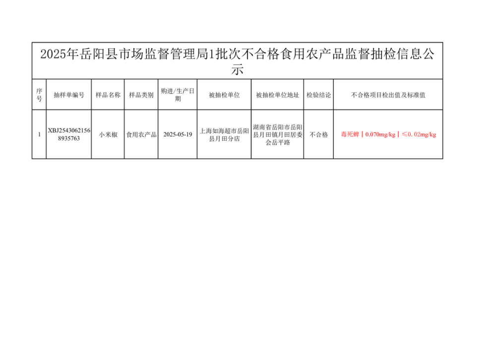 2025年6月27日抽檢數據公示(不合格1批次)