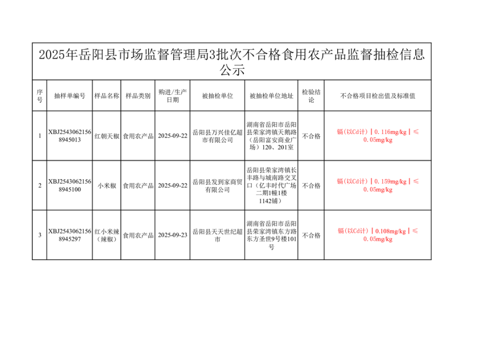 2025年10月31日抽檢數據公示(不合格3批次-華中)