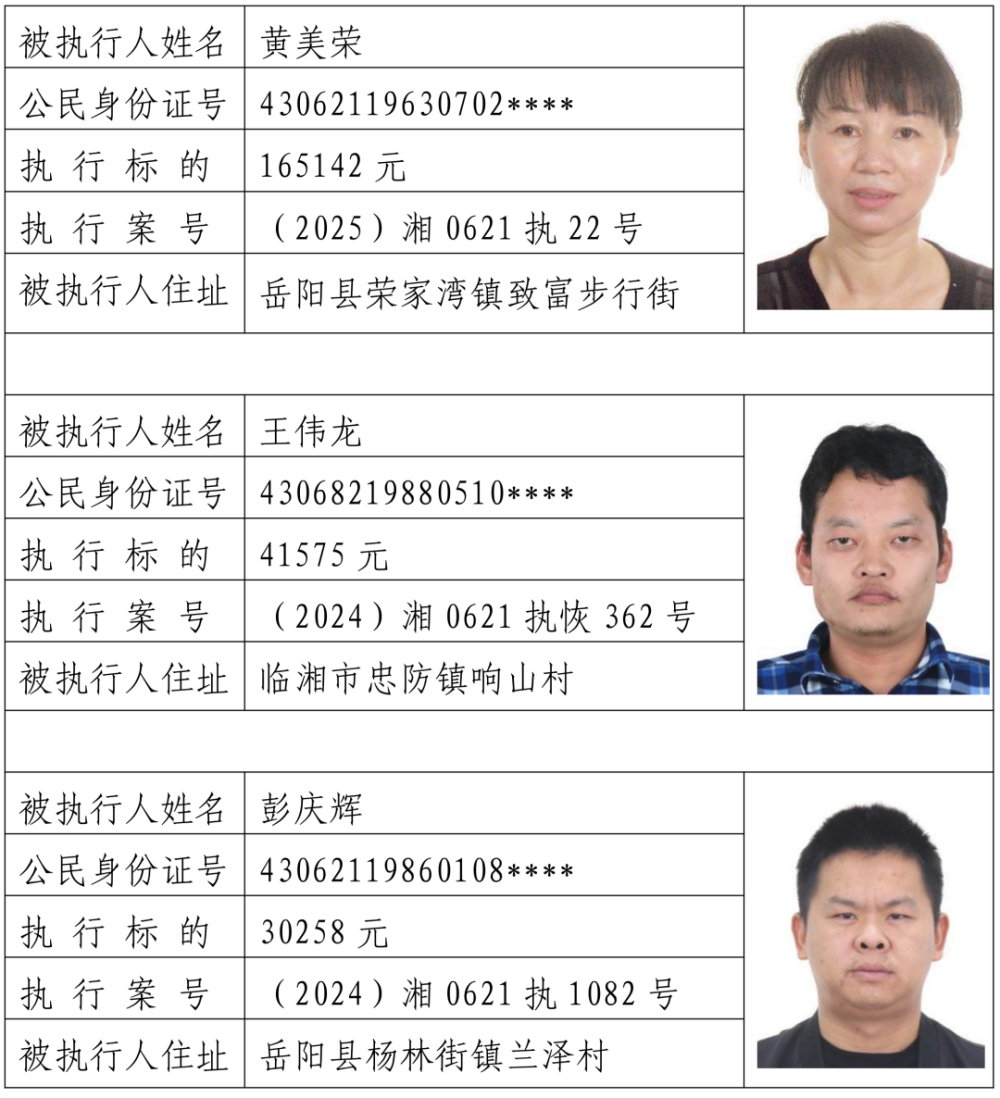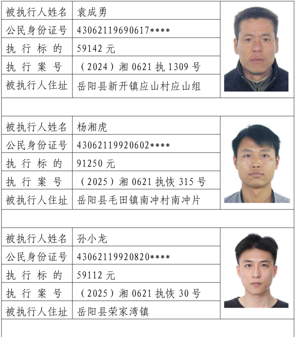 為敦促被執行人自覺履行生效法律文書確定的義務,努力推進社會誠信建設。根據《中華人民共和國民事訴訟法》《最高人民法院關於公布失信被執行人名單信息的若幹規定》等相關法律和規定,本院決定對下列失信被執行人信息予以曝光。曝光人員應立即履行生效法律文書確定的義務,否則將視情節采取罰款、拘留等強製措施,對拒不履行、抗拒執行、規避執行的被執行人將依法追究刑事責任。【備注:下述失信被執行人名單信息僅代表本次曝光時段情況,實時失信被執行人信息以最高院網站查詢結果為準。歡迎廣大人民群眾對已曝光被執行人行蹤及財產線索進行舉報。舉報電話:0730-7668833。】