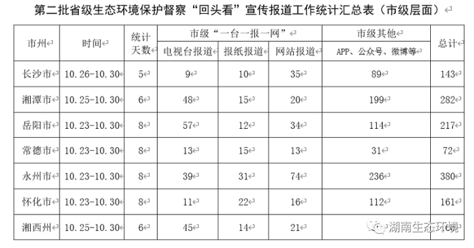 10月23日—26日,第二批7個省級生態環境保護督察組分別進駐相關市州開展督察進駐工作。自督察進駐以來,7市州利用“一台一報一網”(“一台”即市級廣播電視台,“一報”即市級黨報,“一網”即市級政府網站)以及APP、市新聞網、部門官網、微信公眾號、微博等方式宣傳報道和公開“回頭看”督察及整改工作情況。截至10月30日,7個市州與督察相關的宣傳報道總量達1421條,平均每個市州每天近30條。其中,永州市工作力度最大,除市級電視台外,其他各媒體宣傳報道數量均居7個市州之首。