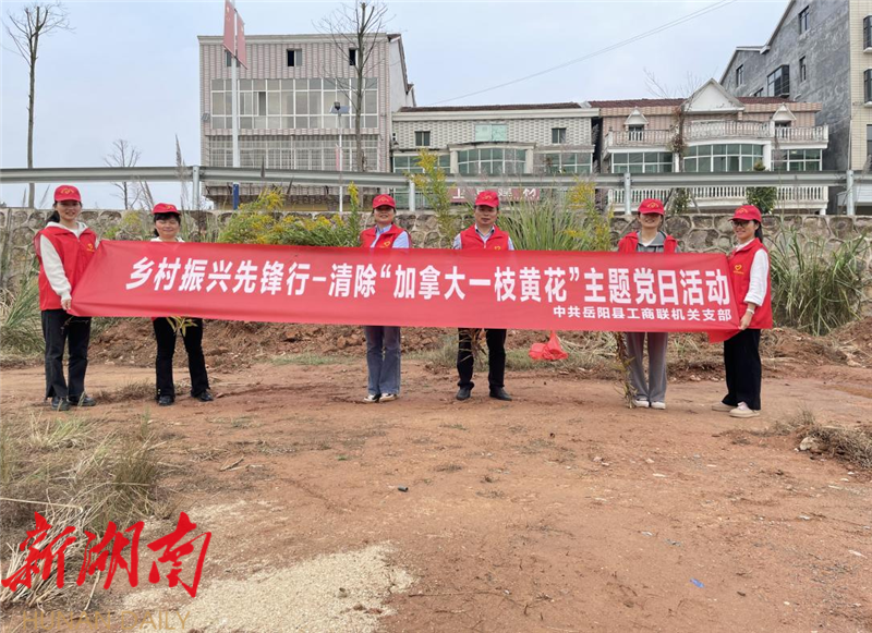 當前,加拿大“一枝黃花”進入生長旺盛期。近日,嶽陽縣工商聯組織全體機關黨員幹部赴駐村幫扶點張穀英鎮蓮花村開展清除“加拿大一枝黃花”主題黨日活動,對轄區內加拿大“一枝黃花”開展拉網式清除。