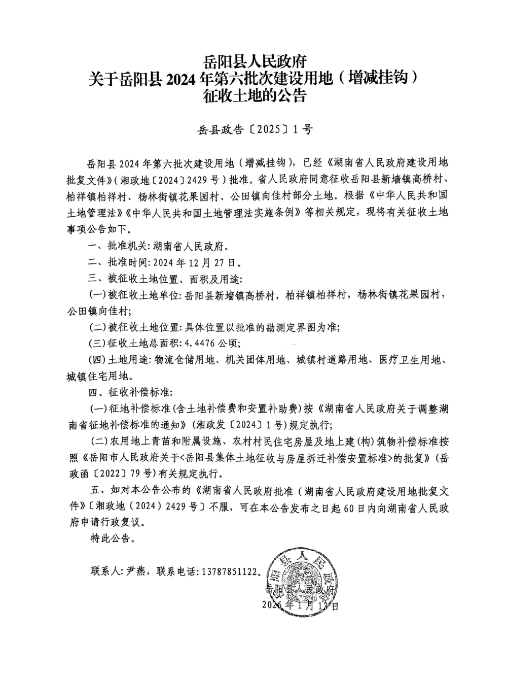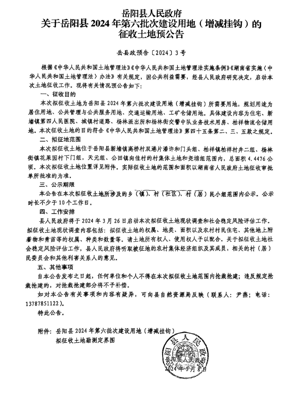 嶽陽縣人民政府 關於嶽陽縣2024年第六批次建設用地(增減掛鉤)征收土地的公告