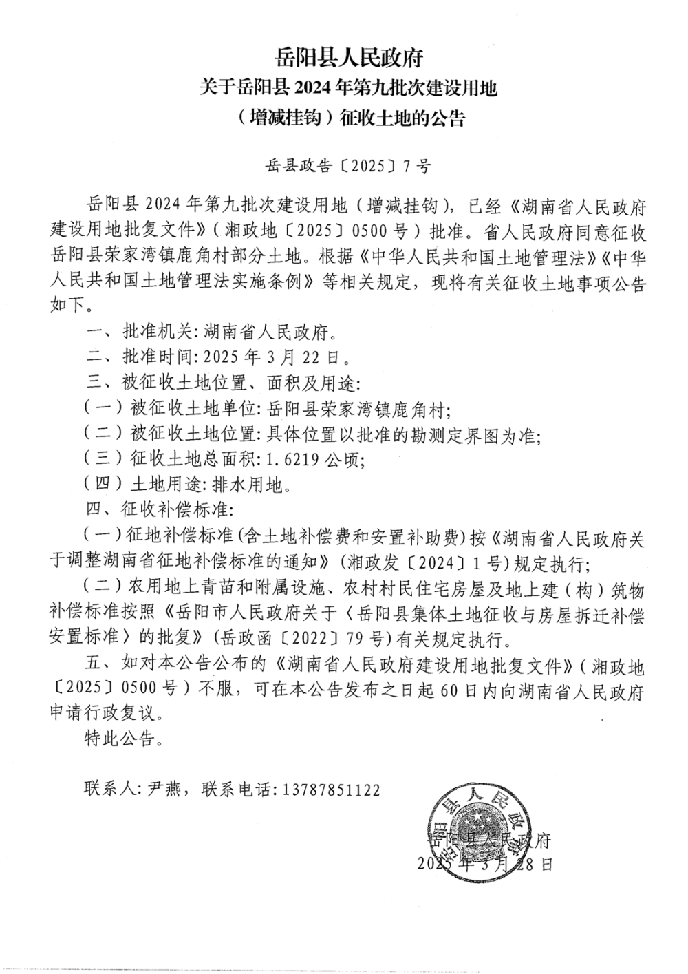 嶽陽縣人民政府 關於嶽陽縣2024年第九批次建設用地 (增減掛鉤)征收土地的公告