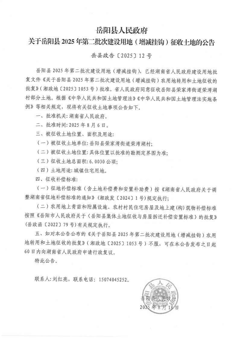 嶽陽縣人民政府關於嶽陽縣2025年第二批次建設用地(增減掛鉤)征收土地的公告