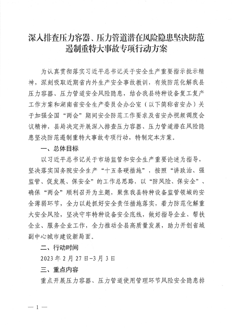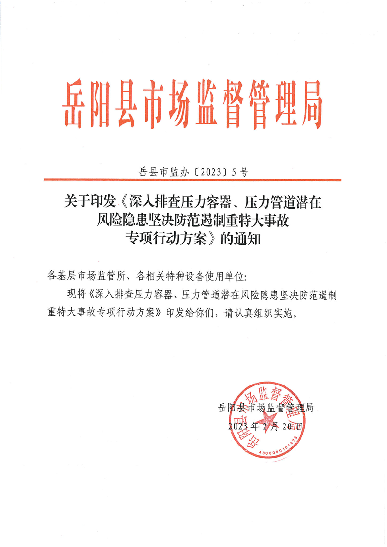 嶽縣市監辦〔2023〕5號關於印發《深入排查壓力容器、壓力管道潛在風險隱患堅決防範遏製重特大事故專項行動方案》的通知
