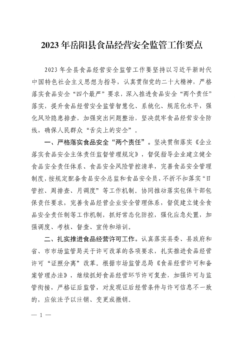 嶽縣市監辦〔2023〕10號關於印發《2023年嶽陽縣食品經營安全監管工作要點》的通知