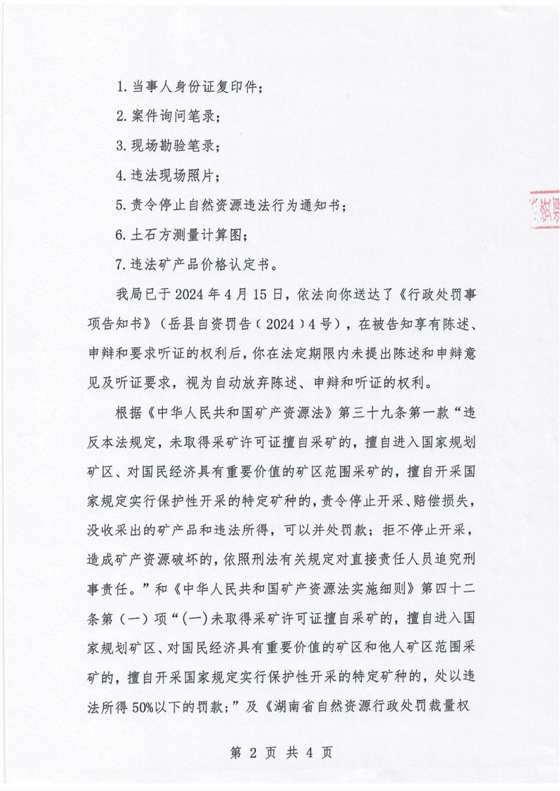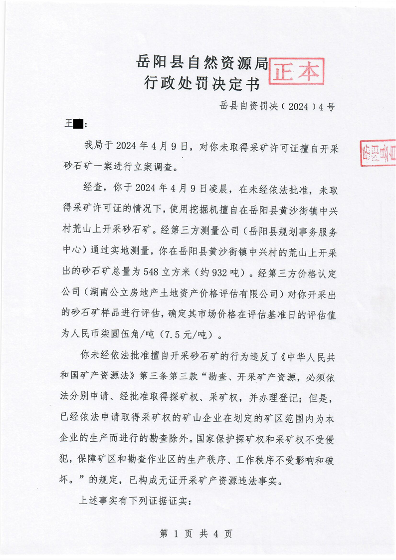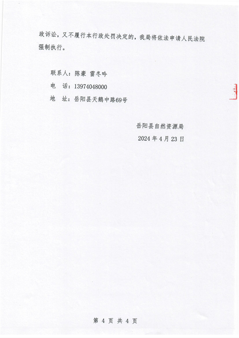 行政處罰決定書 嶽縣自然資罰決〔2024〕第4號