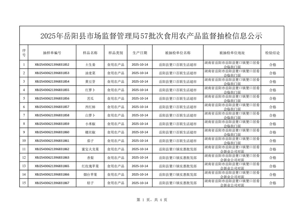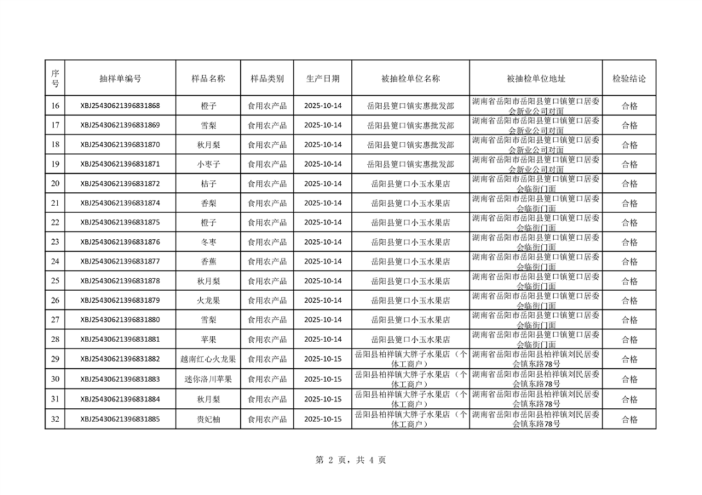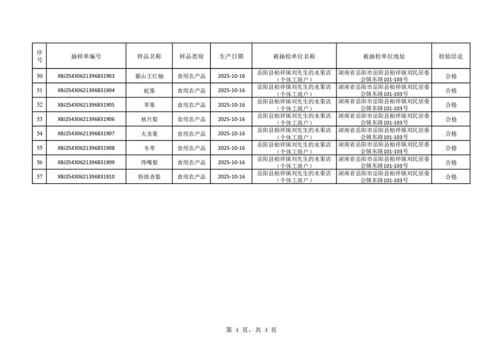 2025年11月24日抽檢數據公示(合格57批次-華中)