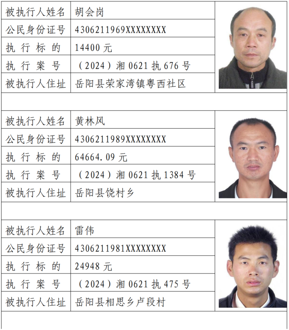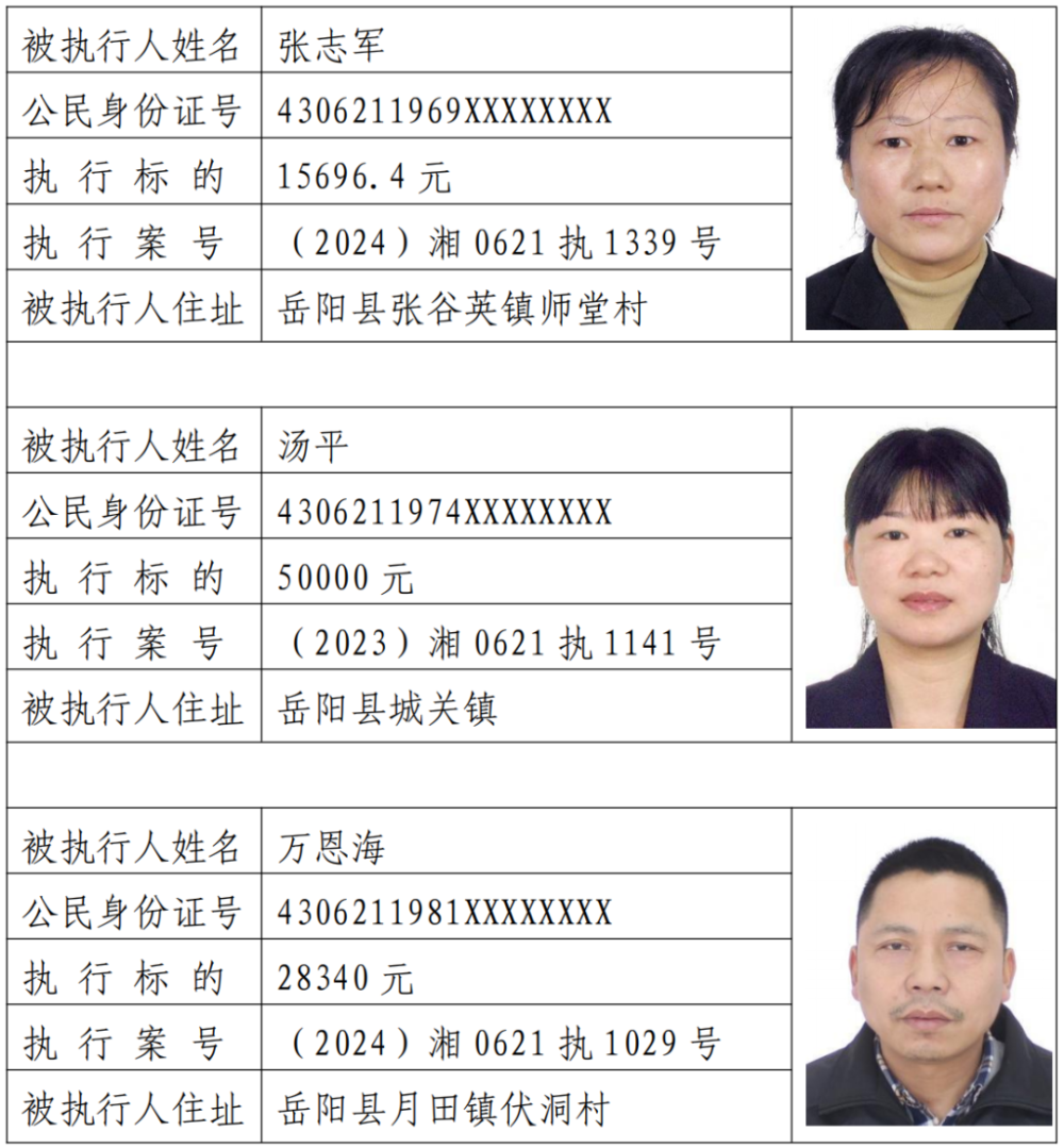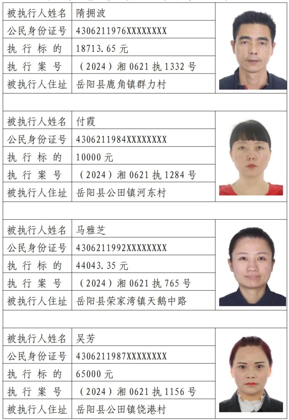 為敦促被執行人自覺履行生效法律文書確定的義務,努力推進社會誠信建設。根據《中華人民共和國民事訴訟法》《最高人民法院關於公布失信被執行人名單信息的若幹規定》等相關法律和規定,本院決定對下列失信被執行人信息予以曝光。曝光人員應立即履行生效法律文書確定的義務,否則將視情節采取罰款、拘留等強製措施,對拒不履行、抗拒執行、規避執行的被執行人將依法追究刑事責任。【備注:下述失信被執行人名單信息僅代表本次曝光時段情況,實時失信被執行人信息以最高院網站查詢結果為準。歡迎廣大人民群眾對已曝光被執行人行蹤及財產線索進行舉報。舉報電話:0730-7668833。】