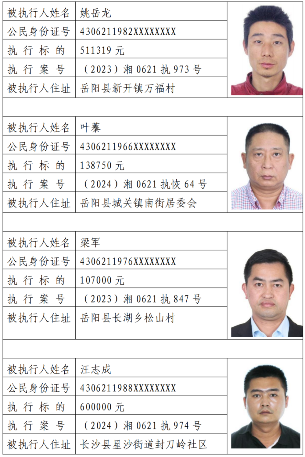 為敦促被執行人自覺履行生效法律文書確定的義務,努力推進社會誠信建設。根據《中華人民共和國民事訴訟法》《最高人民法院關於公布失信被執行人名單信息的若幹規定》等相關法律和規定,本院決定對下列失信被執行人信息予以曝光。曝光人員應立即履行生效法律文書確定的義務,否則將視情節采取罰款、拘留等強製措施,對拒不履行、抗拒執行、規避執行的被執行人將依法追究刑事責任。【備注:下述失信被執行人名單信息僅代表本次曝光時段情況,實時失信被執行人信息以最高院網站查詢結果為準。歡迎廣大人民群眾對已曝光被執行人行蹤及財產線索進行舉報。舉報電話:0730-7668833。】