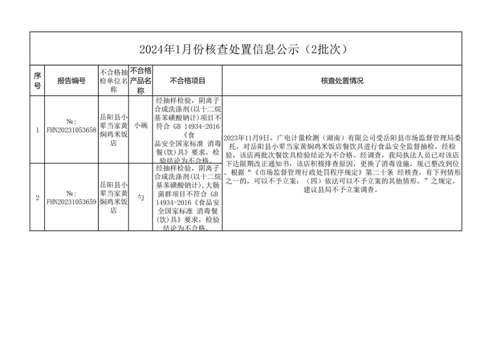 核查處置信息公示(2024年1月份)