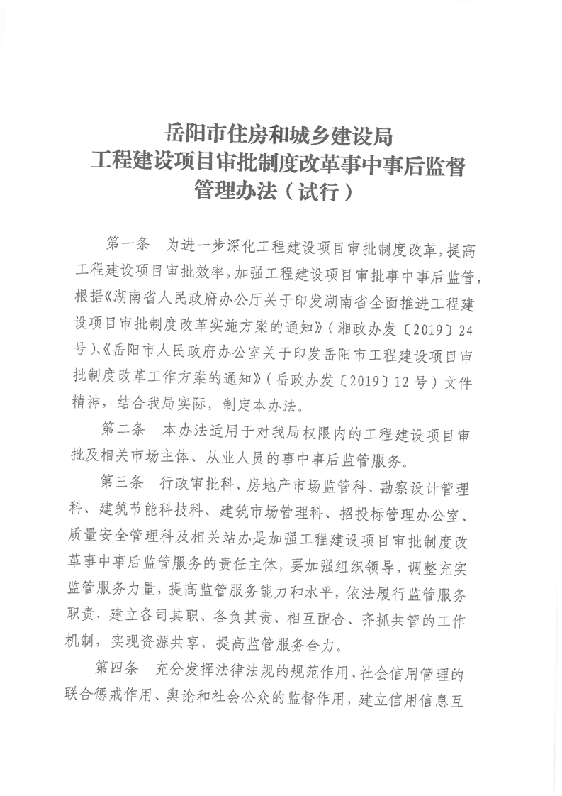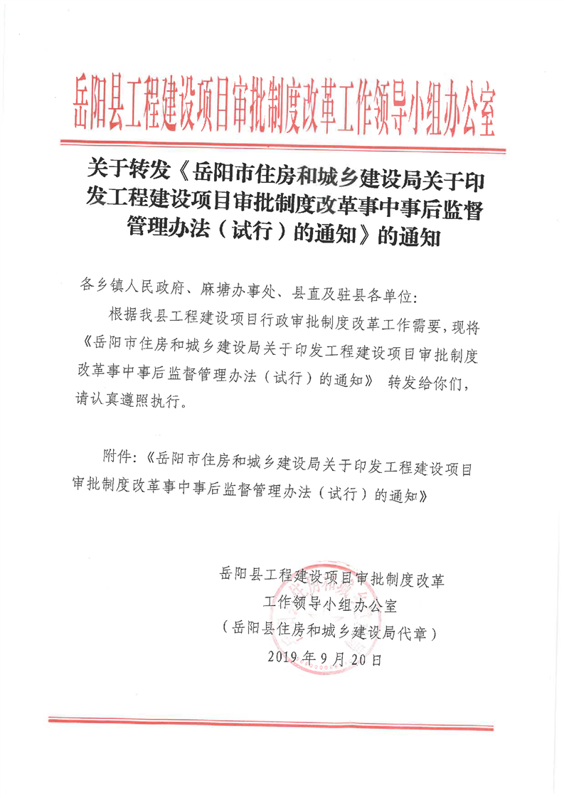 關於轉發《嶽陽市住房和城鄉建設局關於印發工程建設項目審批製度改革事中後監督管理辦法(試行)的通知》的通知