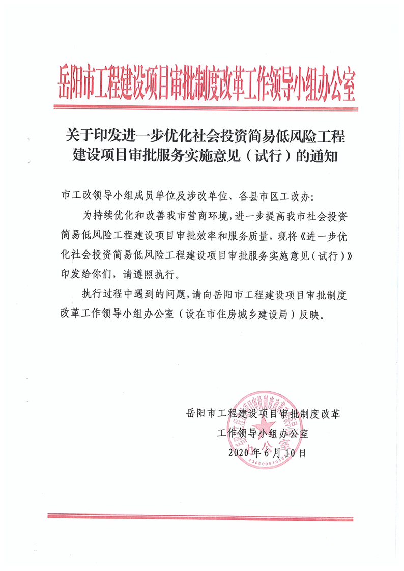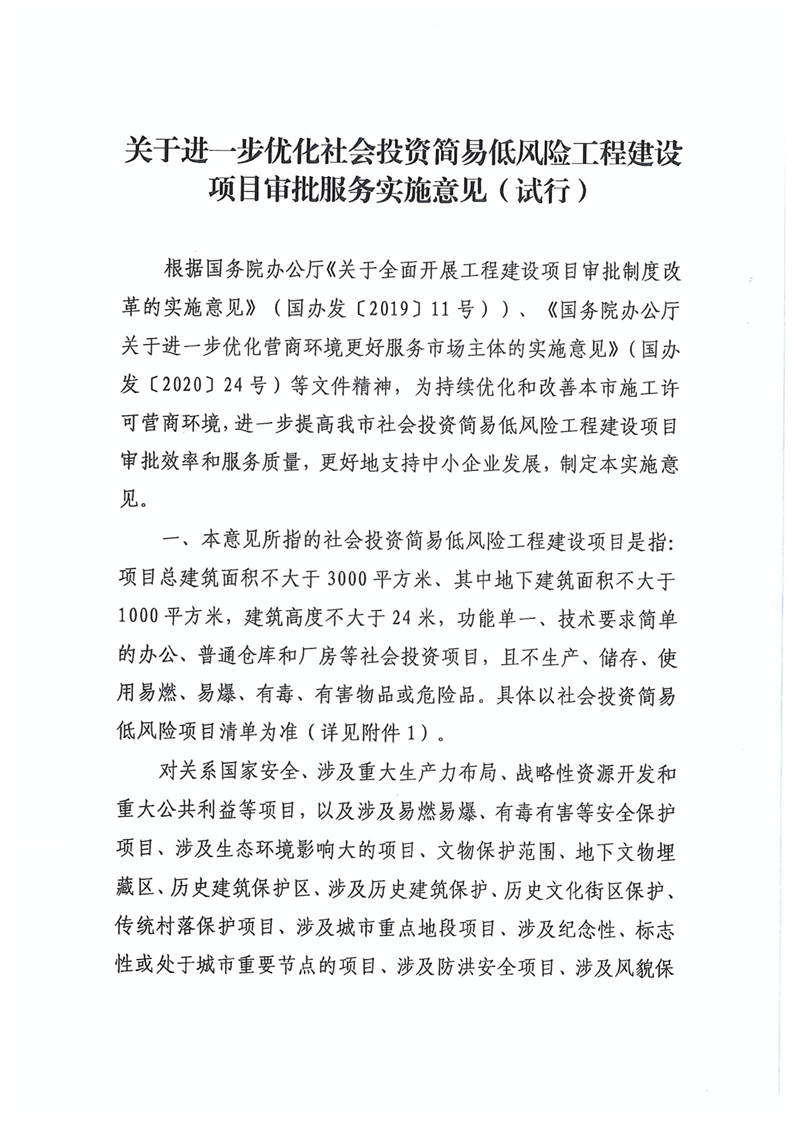 關於轉發《關於印發進一步優化社會投資簡易風險工程建設項目審批服務實施意見(試行)的通知》通知