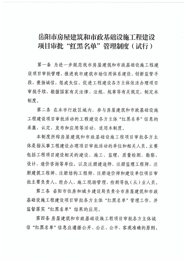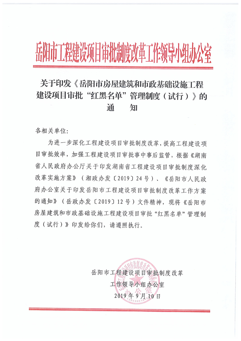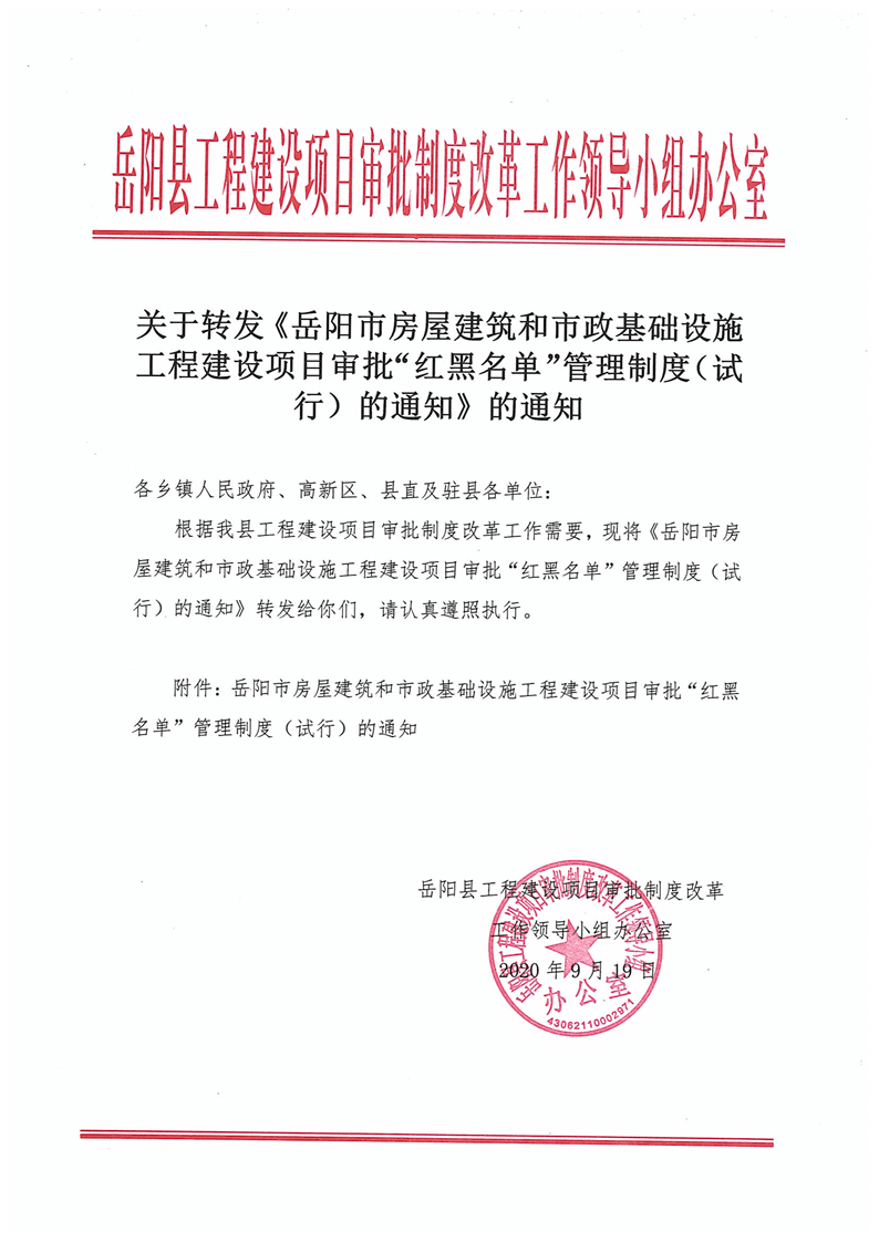 關於轉發《嶽陽市房屋建築和市政基礎設施工程建設項目審批”紅黑名單“管理製度(試行)的通知》