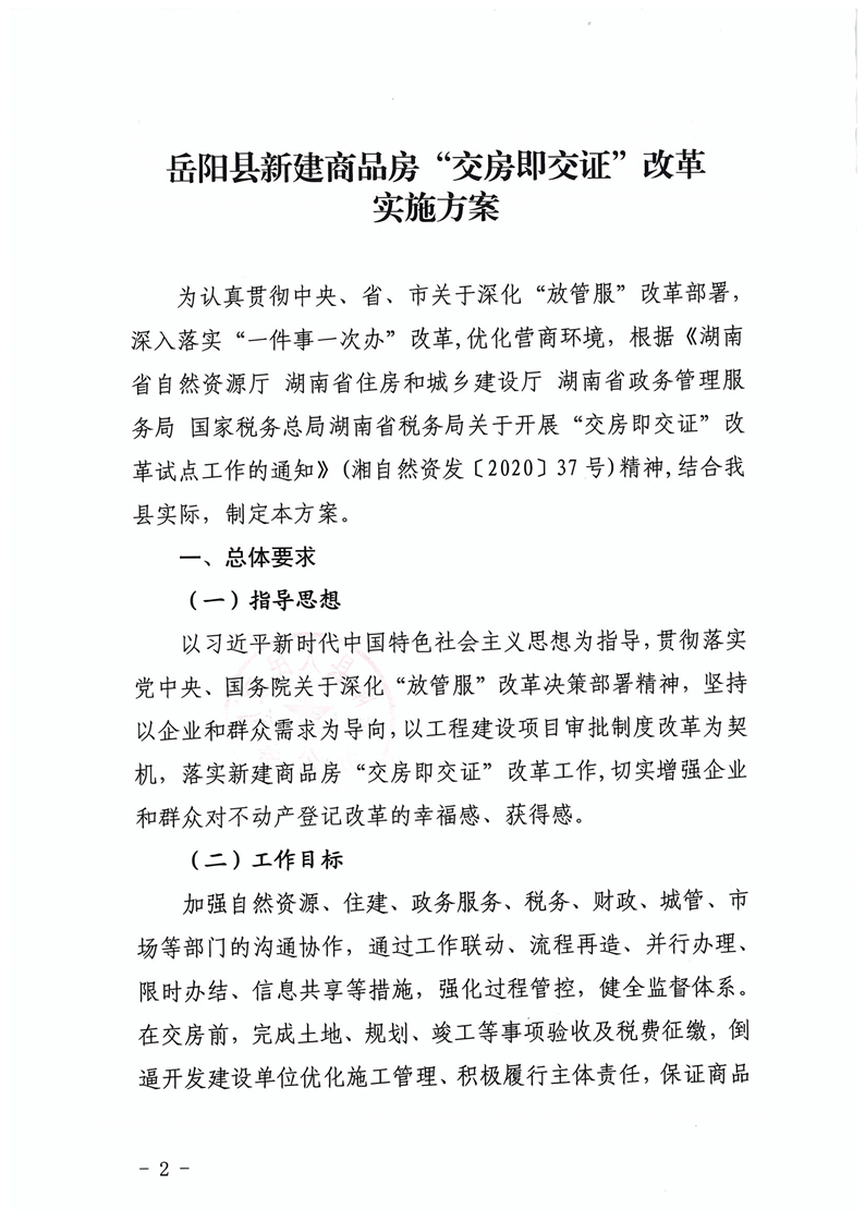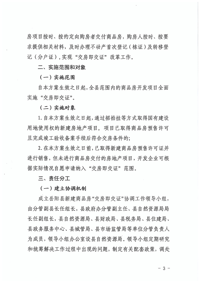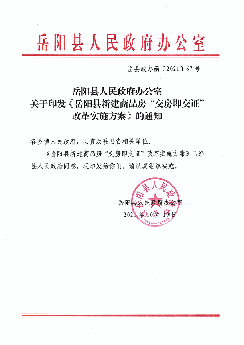 嶽陽縣人民政府辦公室關於印發《嶽陽縣新建商品房“交房即交證”改革實施方案》的通知
