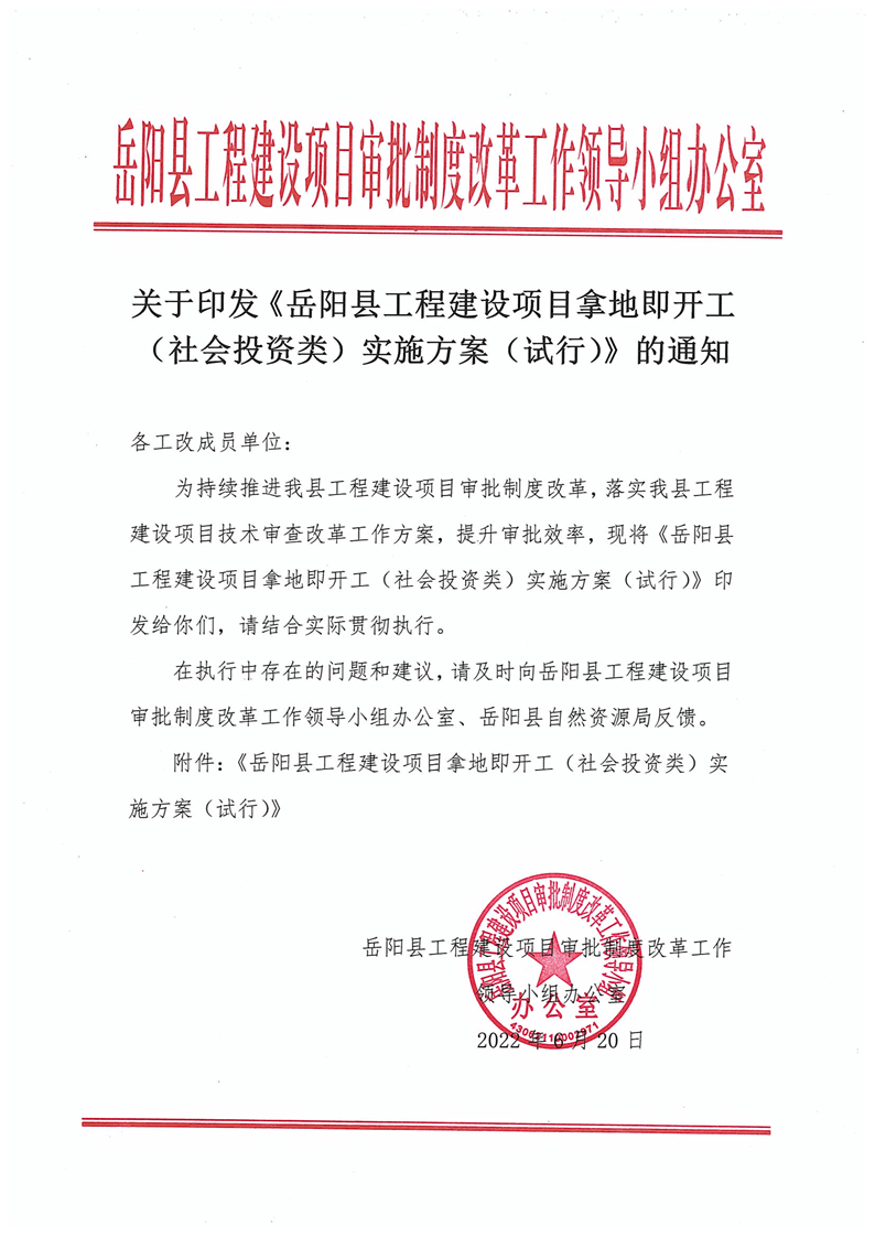 關於印發《嶽陽縣工程建設項目拿地即開工(社會投資類)實施方案(試行)》的通知